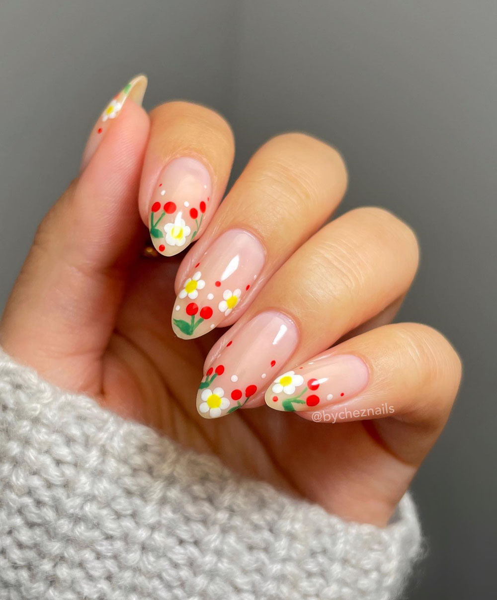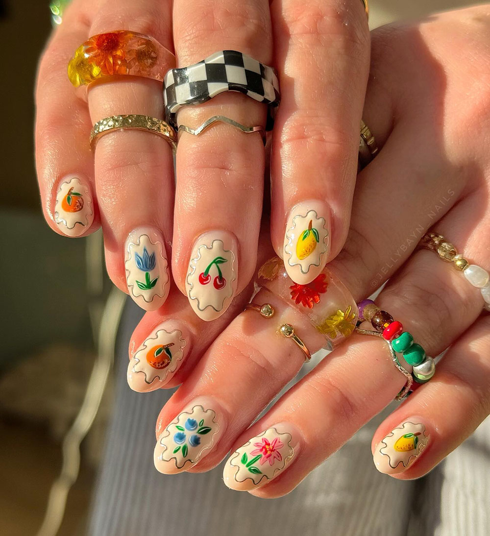 This one is pure cottagecore cuteness! If you’re into soft, floral vibes with a playful twist, these nails are everything. The combo of mini red cherries and sweet daisy blossoms feels like a garden picnic on a sunny afternoon. And that glossy nude base?