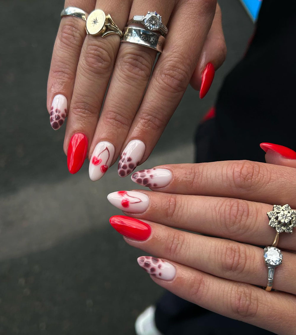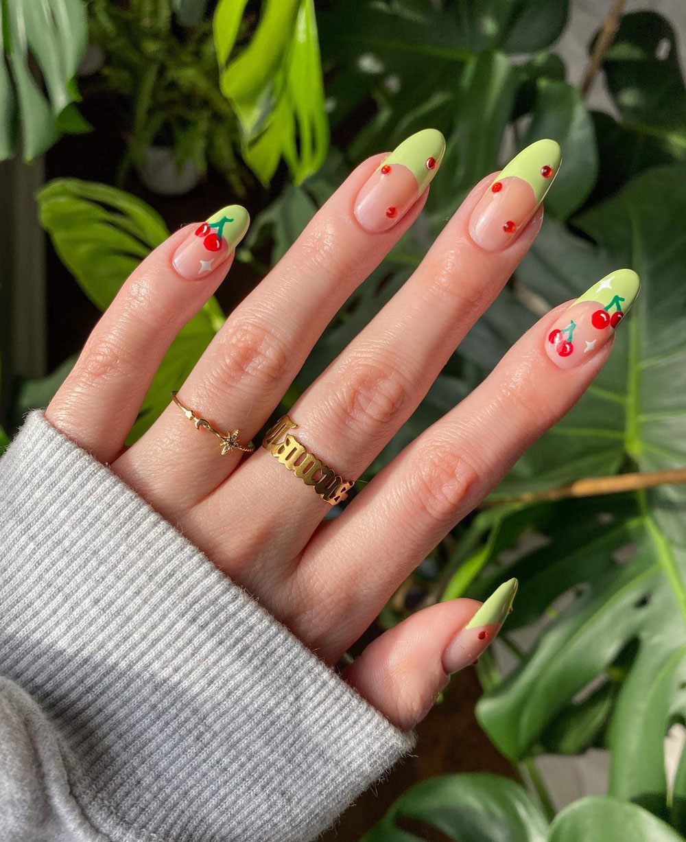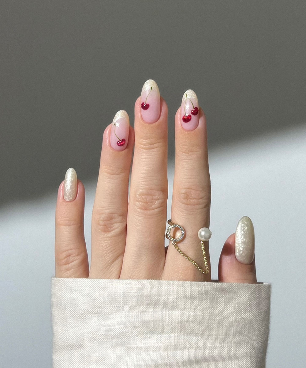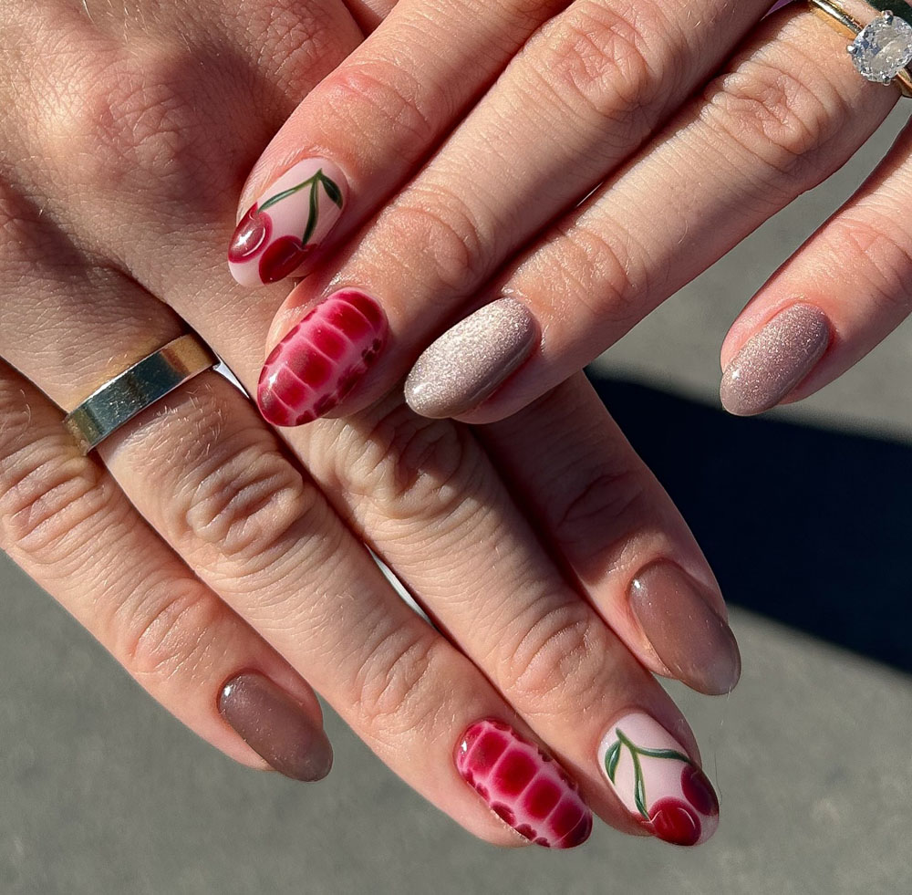 Imagine this: Almond nails with a sheer pink jelly base, shiny glaze finish, gold foil flecks, and red cherry art placed delicately on two or three nails.