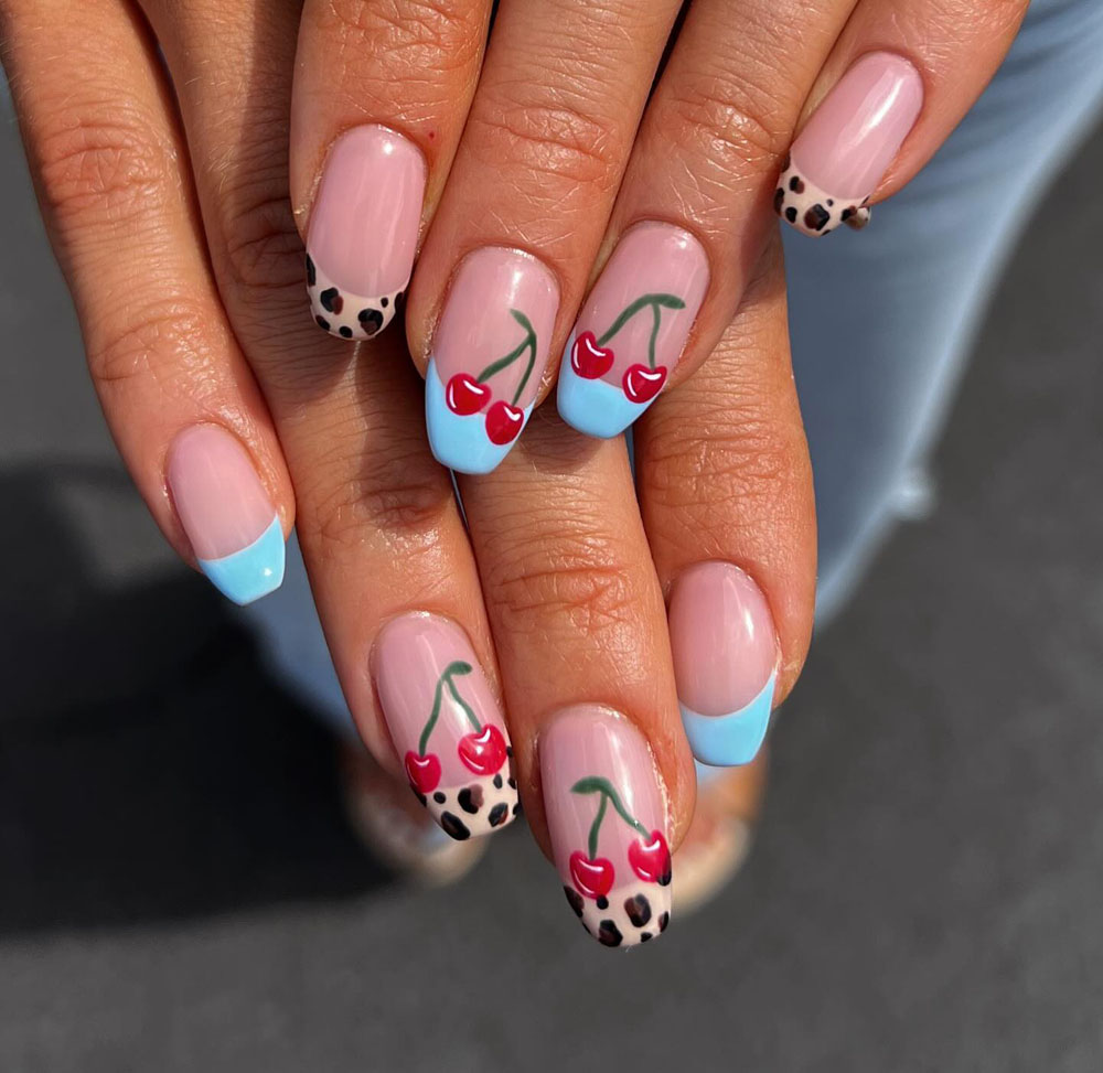 Okay, this one is bringing that trendy edge! Bright blue French tips, cherry accents, and leopard print details? I’m obsessed with how bold this combo is. It’s like Y2K, summer fruit, and fashion week all had a baby—and she’s iconic.