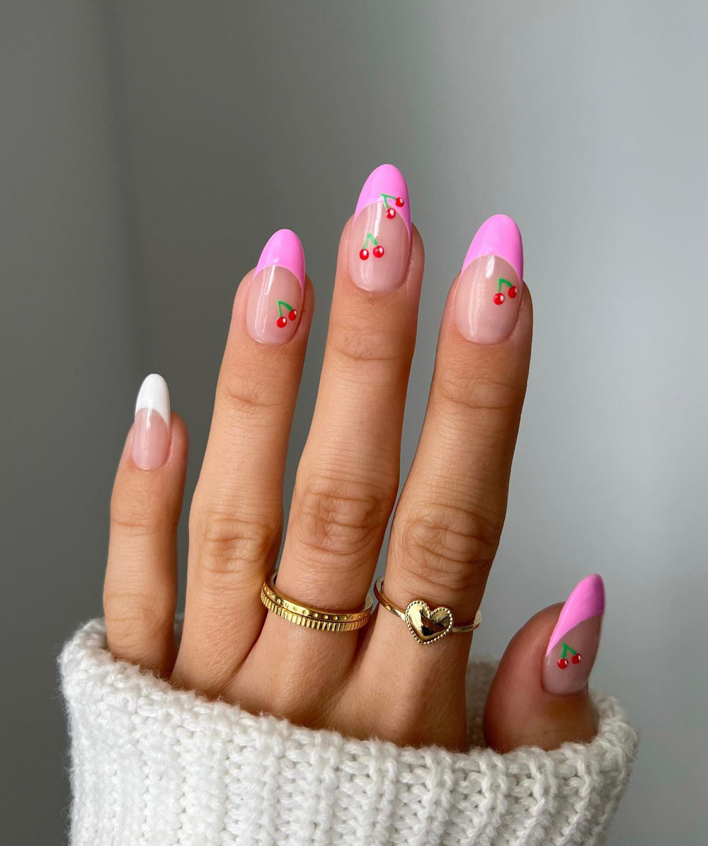 Let’s go loud for a sec! This one’s for the color lovers. Imagine hot pink, electric lime, and neon orange nails with different finishes—some matte, some glossy. Then—bam—add cartoon-style cherries on random fingers like playful stickers.