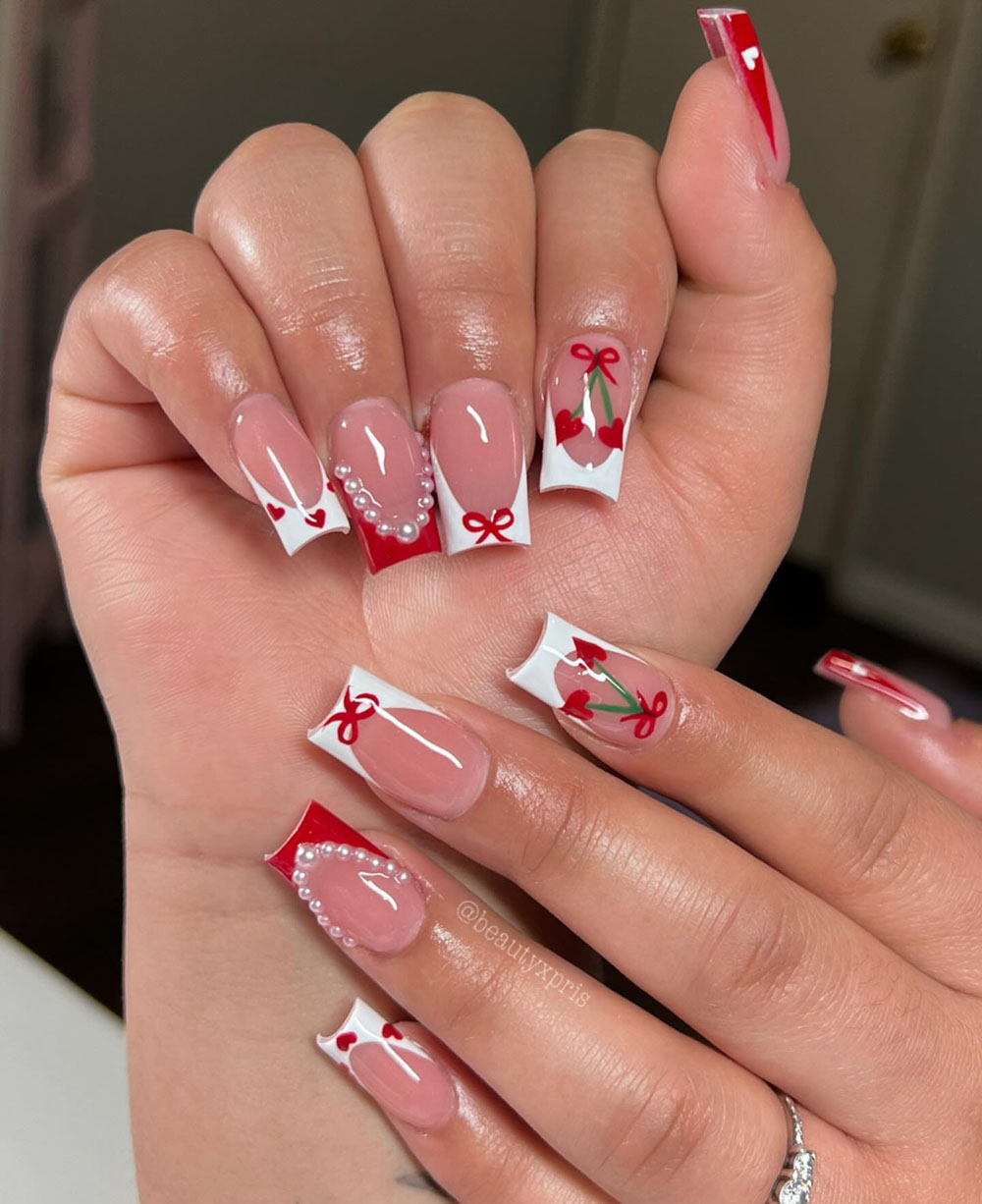 Okayyy, this one is for the girlies who love to turn heads! We’re talking bold red, crisp white tips, adorable cherry clusters and tiny bows? Yes please.