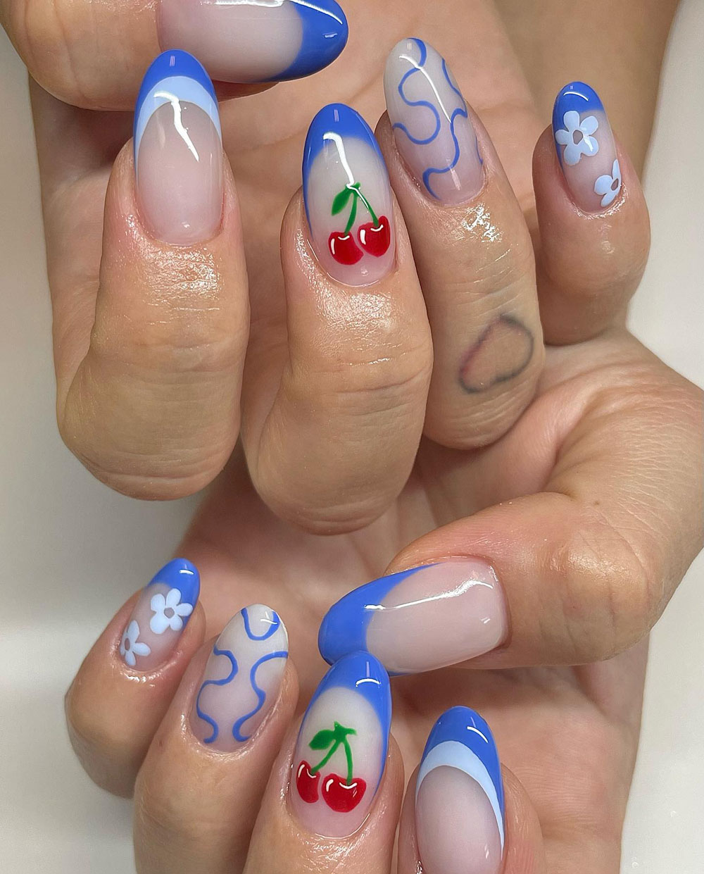 This one’s just plain fun. The bright blue French tips bring so much energy, and the cherry accent nails? So cute, they basically smile at you. Add in those light blue squiggles and mini flowers, and it’s basically a summer festival on your fingertips.