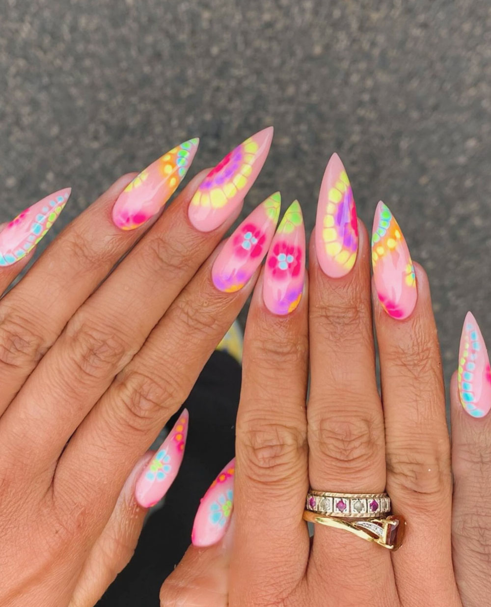 Okay but HOW dreamy is this one?! It’s giving total vacation-in-a-nail energy. Picture this: fruity drinks, beach sunsets, a little flower tucked behind your ear… and these nails sealing the whole vibe. The pastel pink base is such a sweet starting point, but then BOOM — you get this splash of rainbow tie-dye, dotted with tiny flowers that scream summer festival queen.