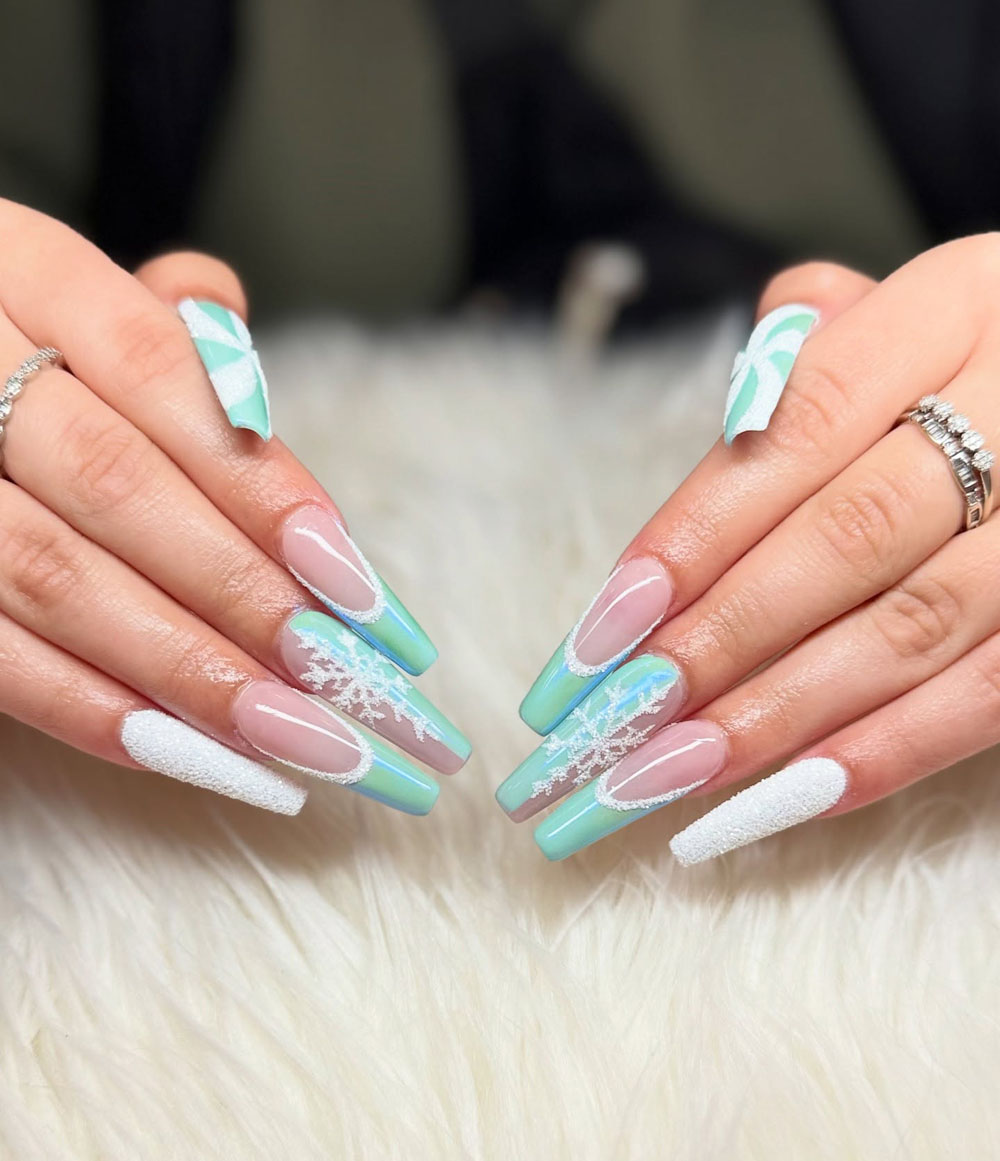 If Elsa moved to Miami, this would be her go-to mani. No joke. That pastel mint fade mixed with icy snowflake accents and sugary white texture is such a vibe. It’s cool, elegant, and just different enough to totally stand out.