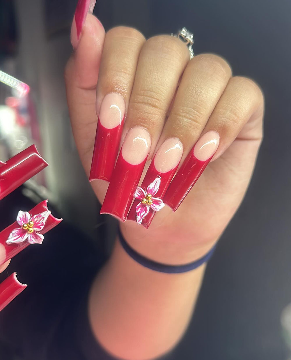 Here’s a classic look with a fiery twist. The red French tips already feel bold and timeless, but that delicate little pink 3D flower? Chef’s kiss. It adds just enough softness to balance out the drama.