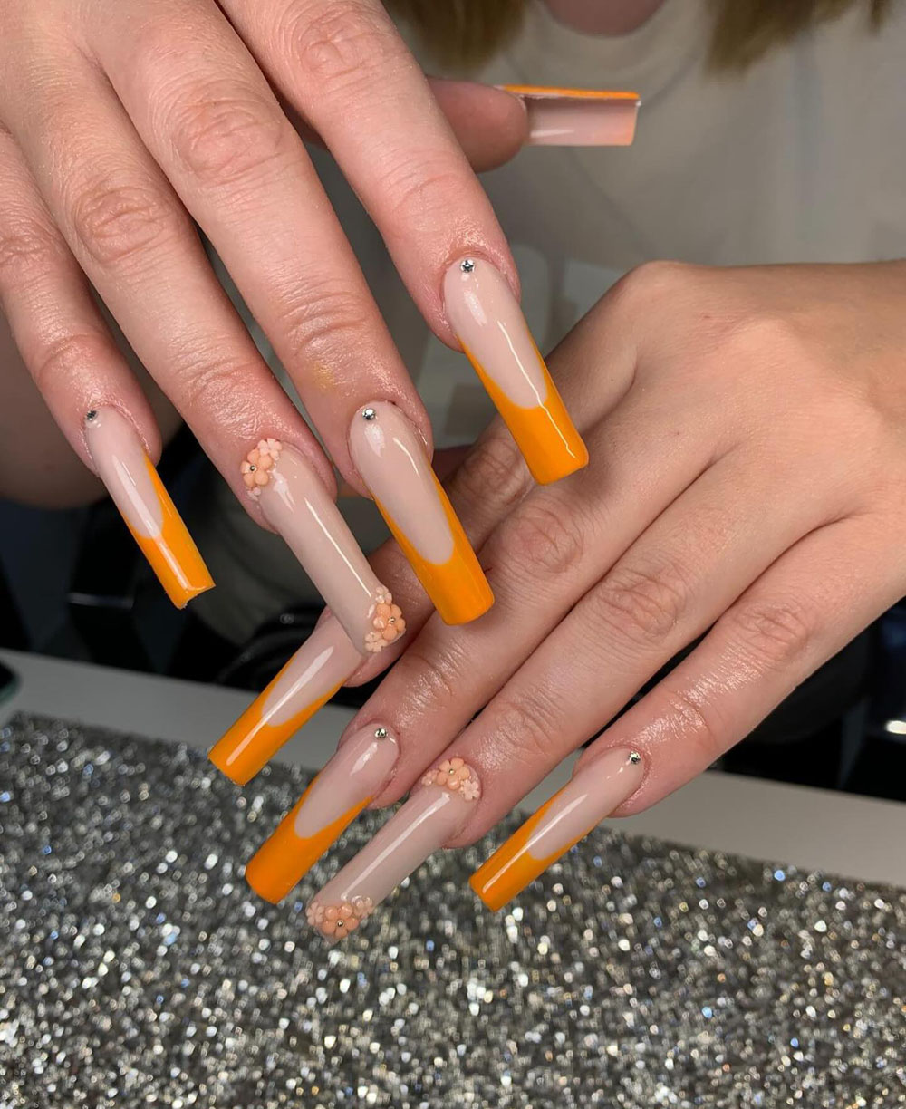 Here’s a unique twist — juicy, zesty, and totally chic! These burnt-orange French tips are already so fresh, but the tiny floral embellishments and crystal studs? They seal the deal. It’s like you bottled the essence of sunshine and turned it into a manicure.