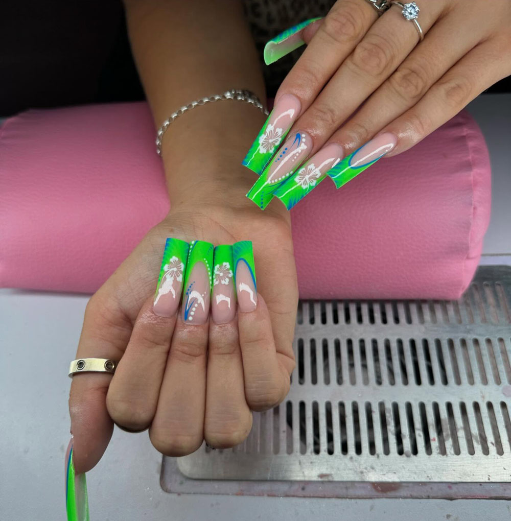 Whoa — talk about a tropical explosion! These green-and-blue tips are giving palm leaf meets paradise party, and those hibiscus-style white flowers? OMG, so good. It’s like a mini vacation on every fingertip.