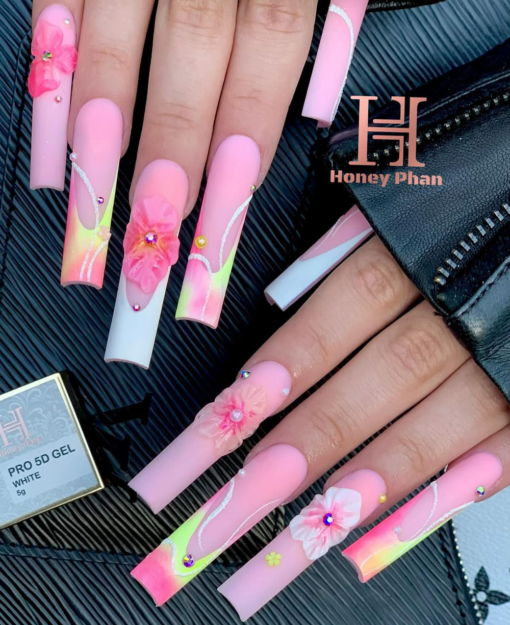 This mani is straight-up dreamy. It’s like a strawberry milkshake met a field of tropical flowers — and yes, I’m totally here for it. The soft pink base is sweet and playful, and then boom — you’ve got neon color-blocking, rhinestones, and 3D flowers that look like they bloomed just for you.