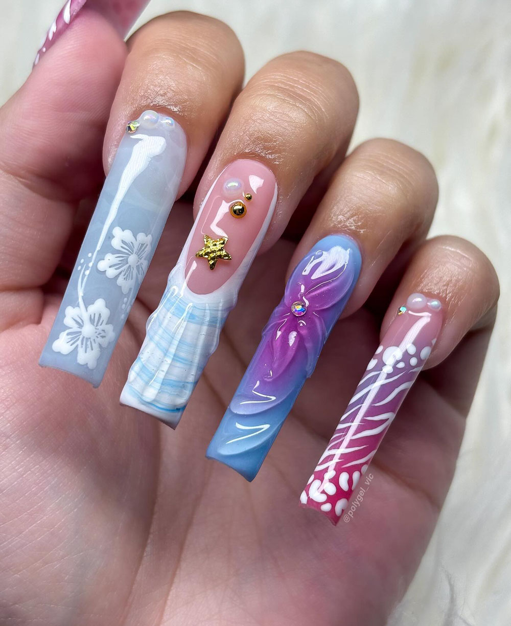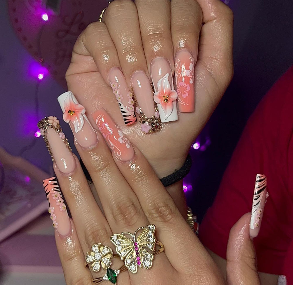 Okay, this one is doing the most — in the best way. We’ve got coral, nude, gold gems, zebra stripes, florals, swirls… it’s like every summer trend rolled into one mani and somehow it totally works. I’m literally obsessed.