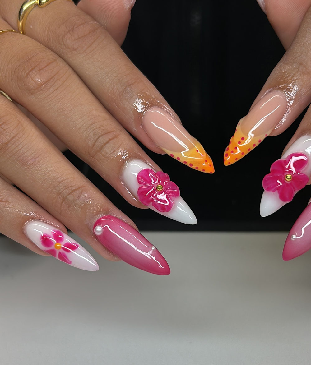 OMG how cute is this mix of citrusy neon tips, white bases, and bold pink 3D florals?! The way it switches up from orange dotted tips to bright white with soft florals — obsessed. It’s giving fruity, fun, and totally fabulous.
