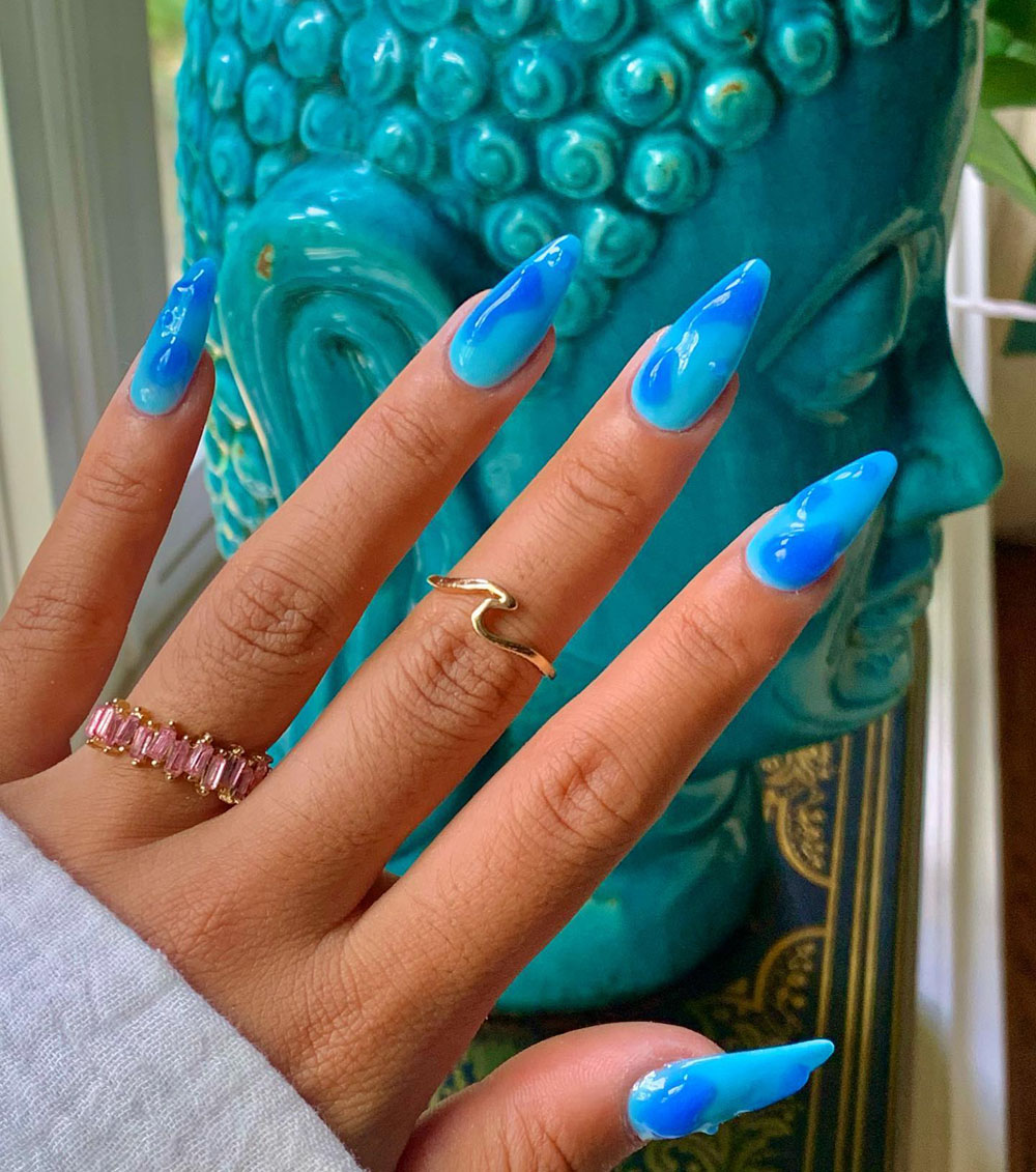 Imagine this: Coffin-shaped nails with soft teal-and-white marble swirls, topped with light blue chrome overlays and a high-gloss finish. Add a tiny gold charm near the cuticle on a couple of nails for extra vacation glam.