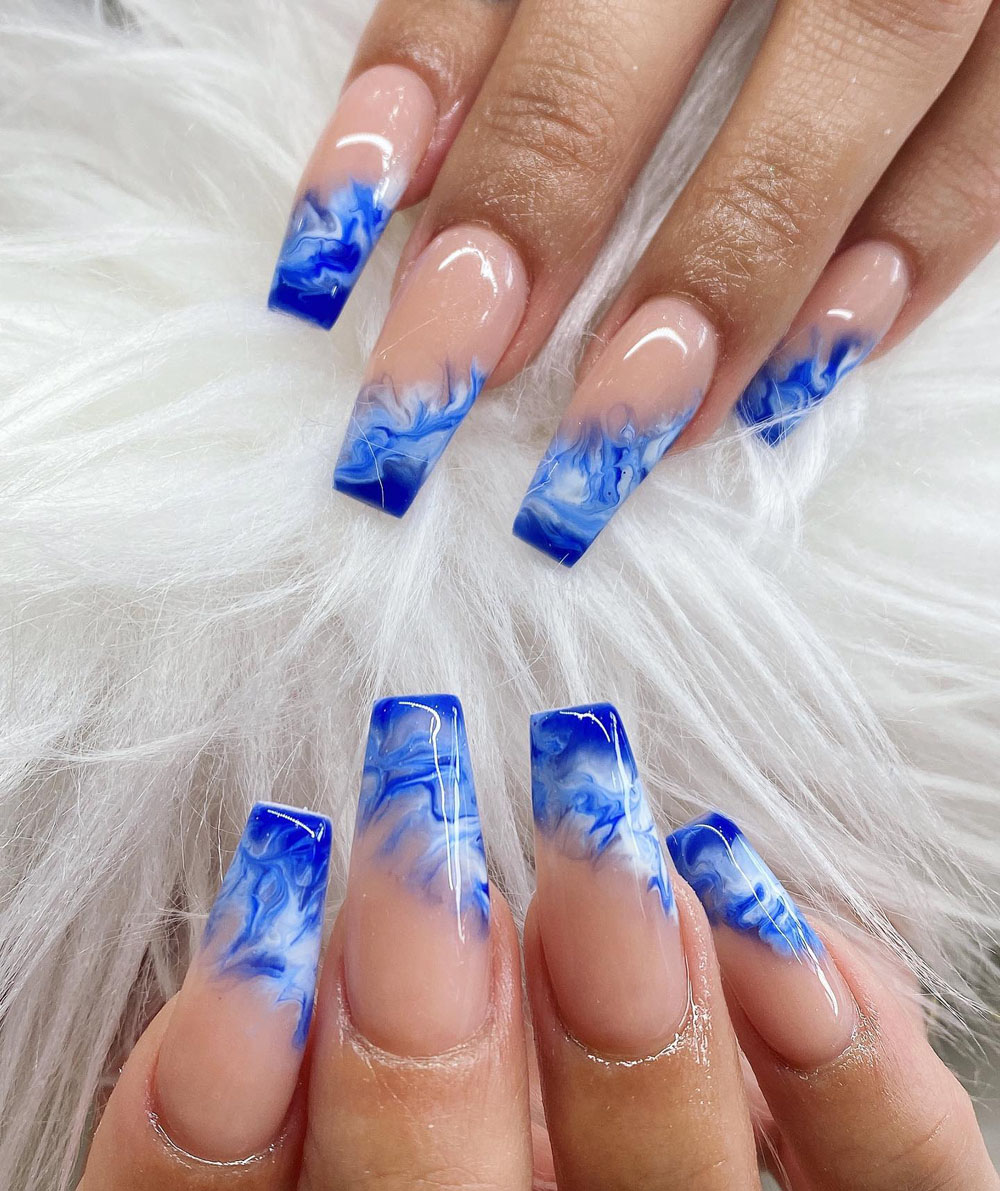 Here’s a chic twist on a classic — and OMG, I’m totally living for it. These blue marble French tips are like dipping your fingertips into a cloud-painted ocean. The nude base keeps things clean and classy, while that rich swirl of blue brings allll the cool vibes.