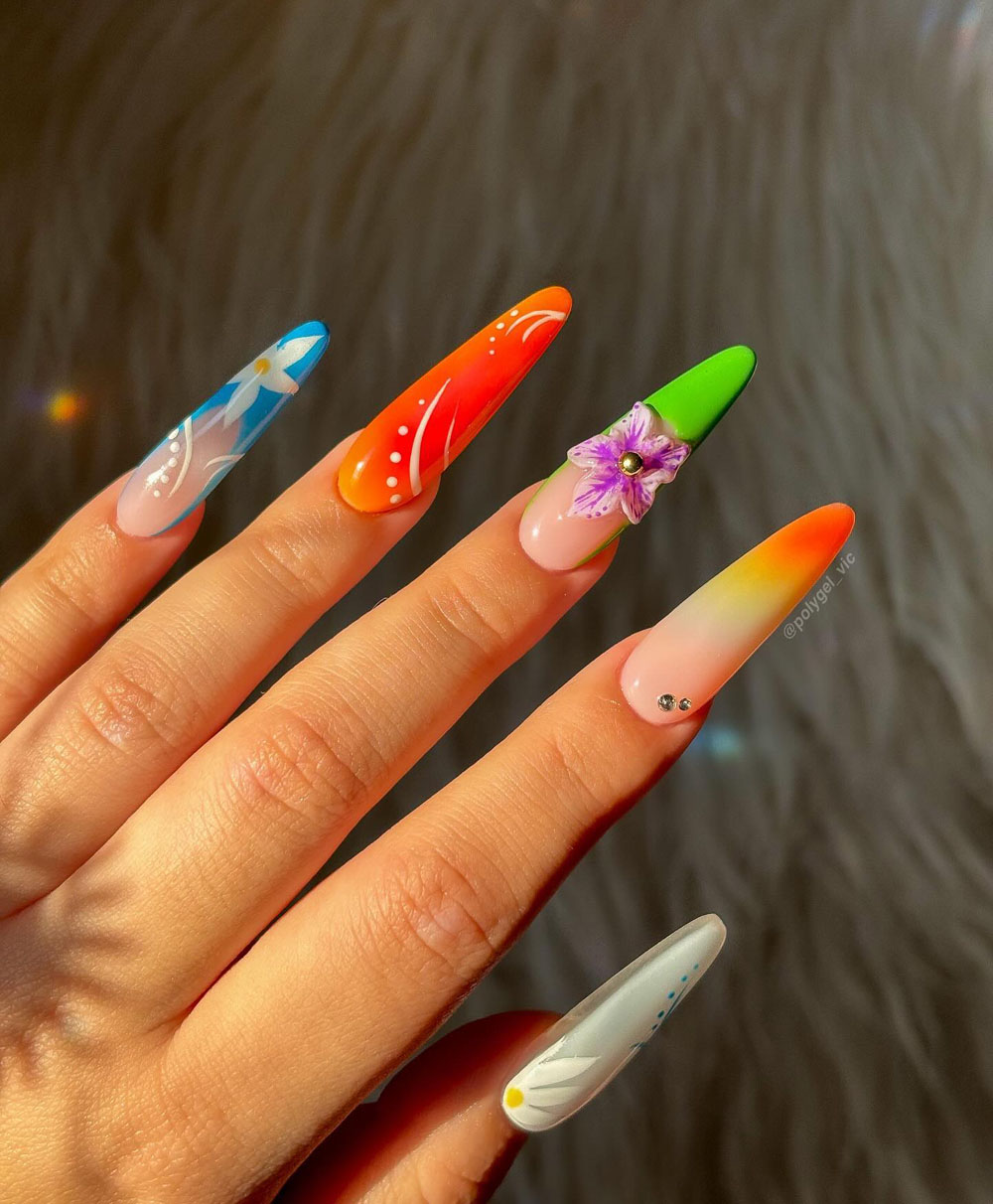 If a tropical smoothie turned into a manicure… it’d be this one. Seriously. The colors are so juicy — bright orange, electric green, sky blue — and the flowers add the cutest little touch of island flair. I can almost taste the mango and feel the beach breeze.