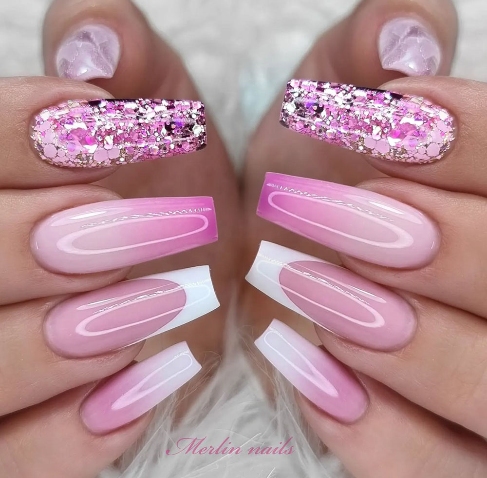 OMG, how dreamy is this set?! It’s like the Barbiecore trend got dipped in fairy dust. The mix of glossy pink gradients with delicate white outlines is already a total vibe, but then BOOM — you get those chunky glitter bombs on the thumbs that take things to sparkle heaven. Seriously, it’s giving glam-meets-cute in the best possible way.