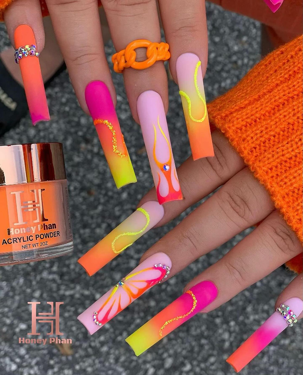 Hot. Bright. Bold. This one is SUCH a summer showstopper! Between the ombré neons, fire flames, sparkles, and butterflies — it’s giving full-on Y2K rave fairy energy. If you love standing out and aren’t afraid of color, this one is so for you.