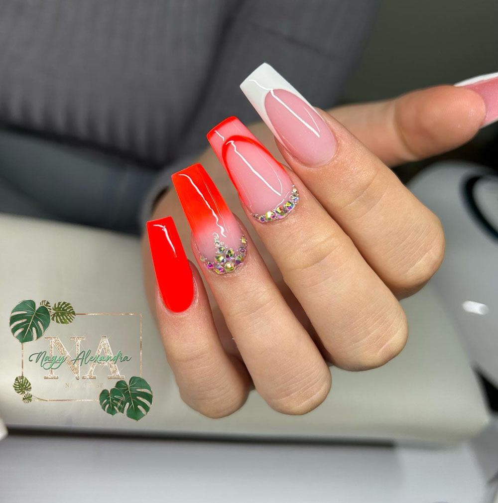 Umm… can we just take a moment for this royal coral glow-up?! These nails are like a crown jewel and sunset had a baby. The ombré coral fade, rhinestone embellishments, and that pop of white French? It’s giving rich girl summer, no doubt.