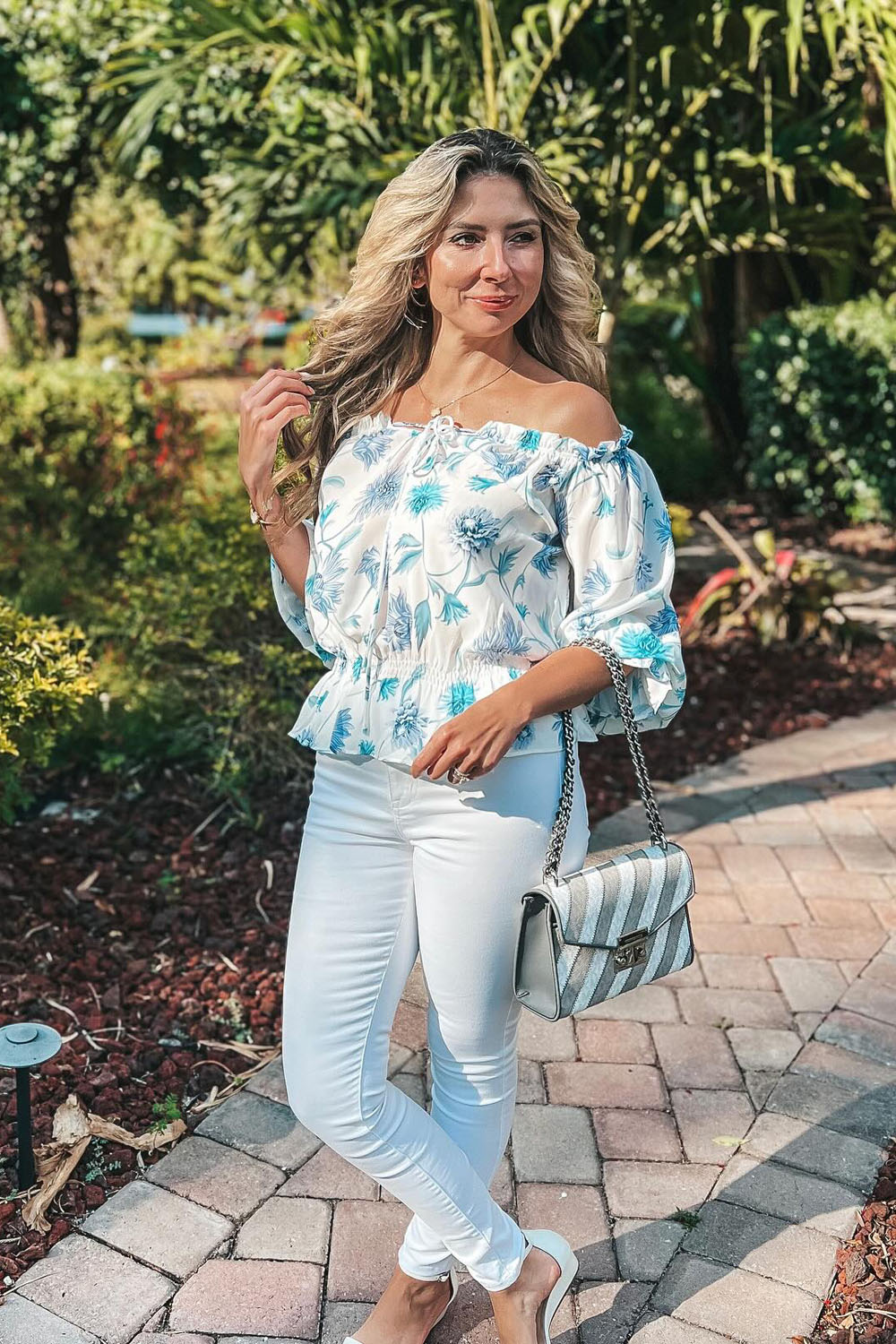 If you’re dreaming of light and breezy vibes, this one’s calling your name! The off-shoulder floral top is soft, playful, and perfect for soaking up sunshine. Paired with crisp white skinny jeans, this outfit is giving major “put-together but effortless” energy. The flirty blue florals add that pop of freshness we all crave in summer looks. Plus, it’s mom-friendly without being basic—win!