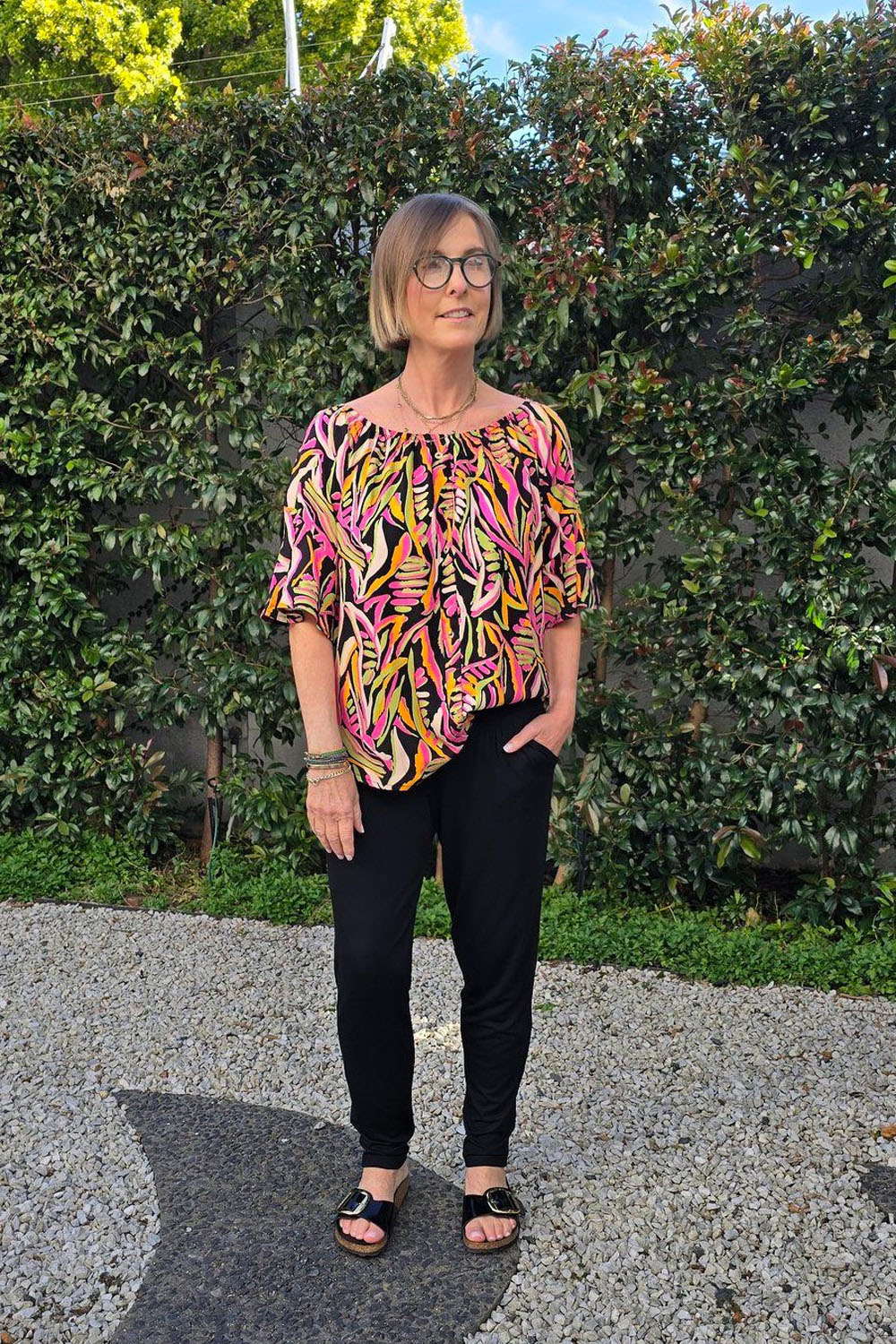 Here’s one that’s made for bold moms who love a pop of color! The vibrant pink-orange print blouse paired with relaxed black pants is the definition of “fun meets comfy.” The wide neckline gives off a relaxed vacation feel while the shape still keeps things pulled together.