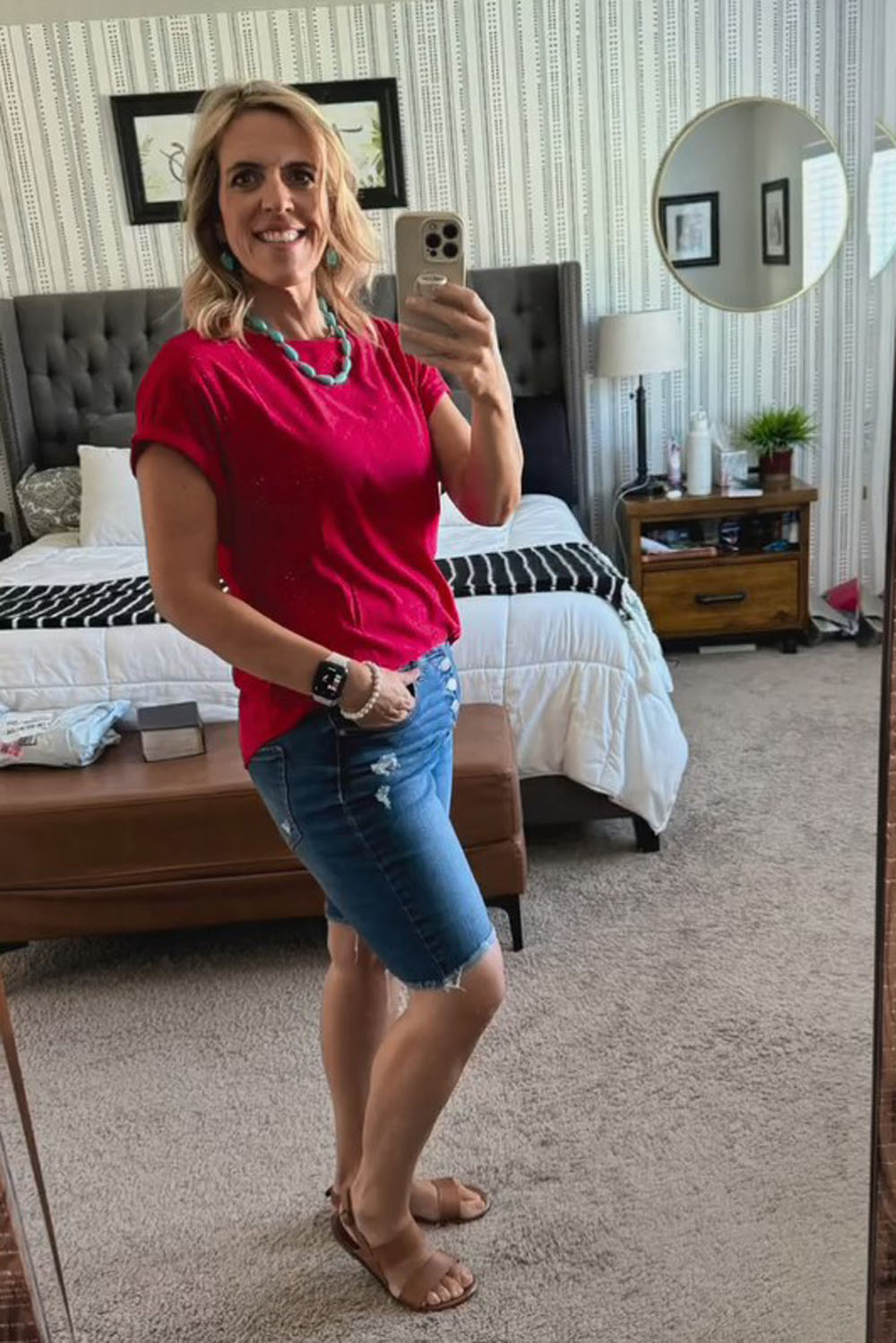 Okay, can we talk about how easy this look is—but still SO stylish? A fitted red tee tucked into distressed denim Bermuda shorts is such a flattering combo for summer days. Toss in a statement necklace and strappy sandals, and it’s giving cute mom energy with a side of confidence.