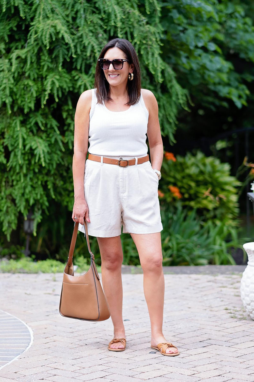 If you’re dreaming of cozy chic, here’s the move! This creamy white tank and high-waisted shorts combo is the ultimate breathable summer fit. The brown leather accents from the belt, sandals, and handbag pull everything together in a way that’s effortless and clean.
