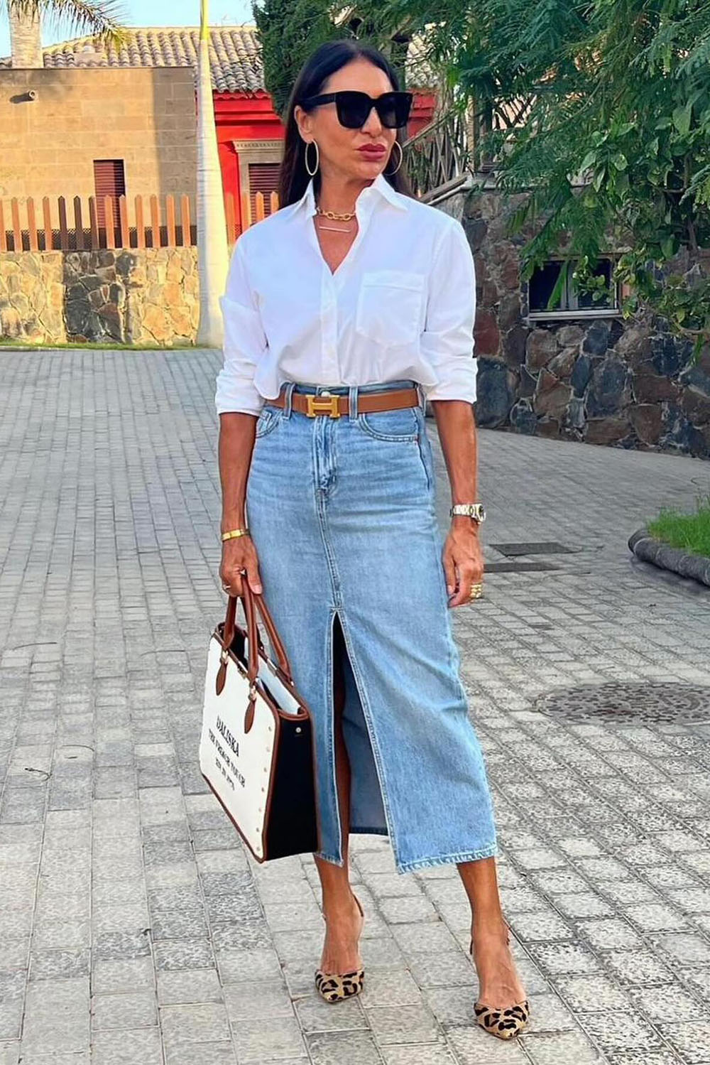 We’re closing it out with serious main character energy. A crisp white button-down tucked into a sleek front-slit denim midi skirt? YES. It’s timeless, flattering, and just screams confidence. The leopard heels and structured designer tote just take it to another level.