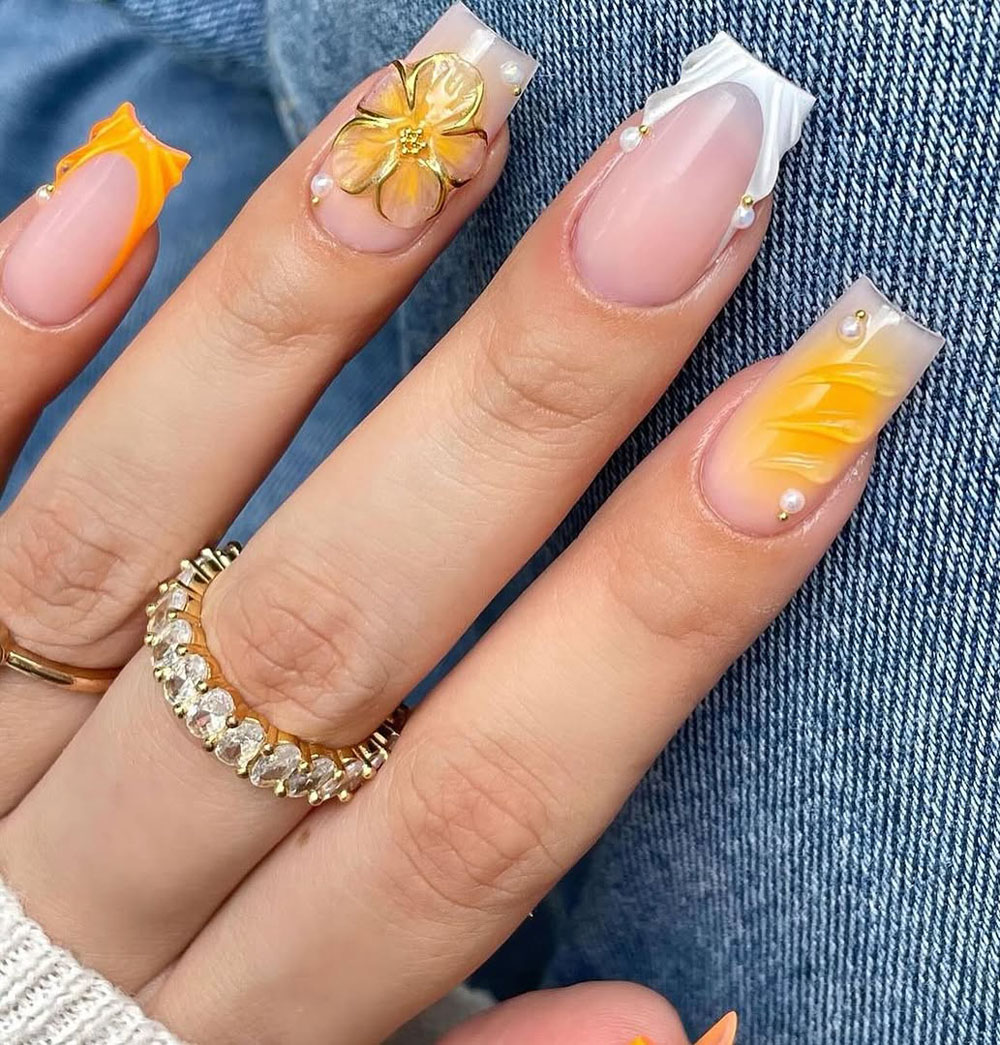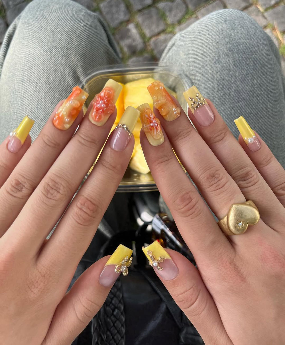 OMG, how cute is this?! If you’re into artsy glam with a citrusy twist, this one’s gonna be your summer obsession. The soft nude base keeps things clean and classy, while the yellow-orange 3D accents and that glossy flower detail bring in total vacation energy. And don’t even get me started on the pearls—they’re giving elegant-meets-playful in the best way.