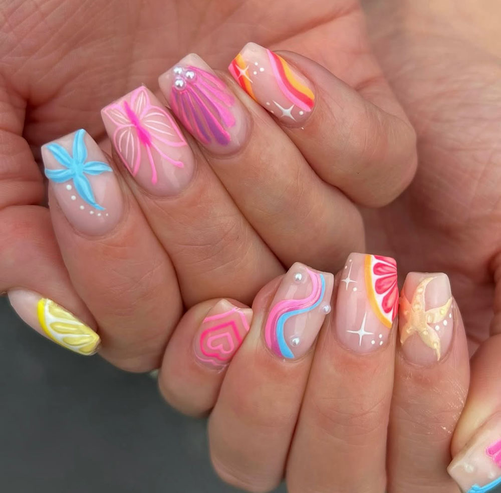 This one’s like a scrapbook of summer! Each nail has a different tiny design—like little love hearts, seashells, starfish, citrus slices, and swirls. The pastel colors and pearl accents give it that soft, artsy energy, but still with a beachy pop.