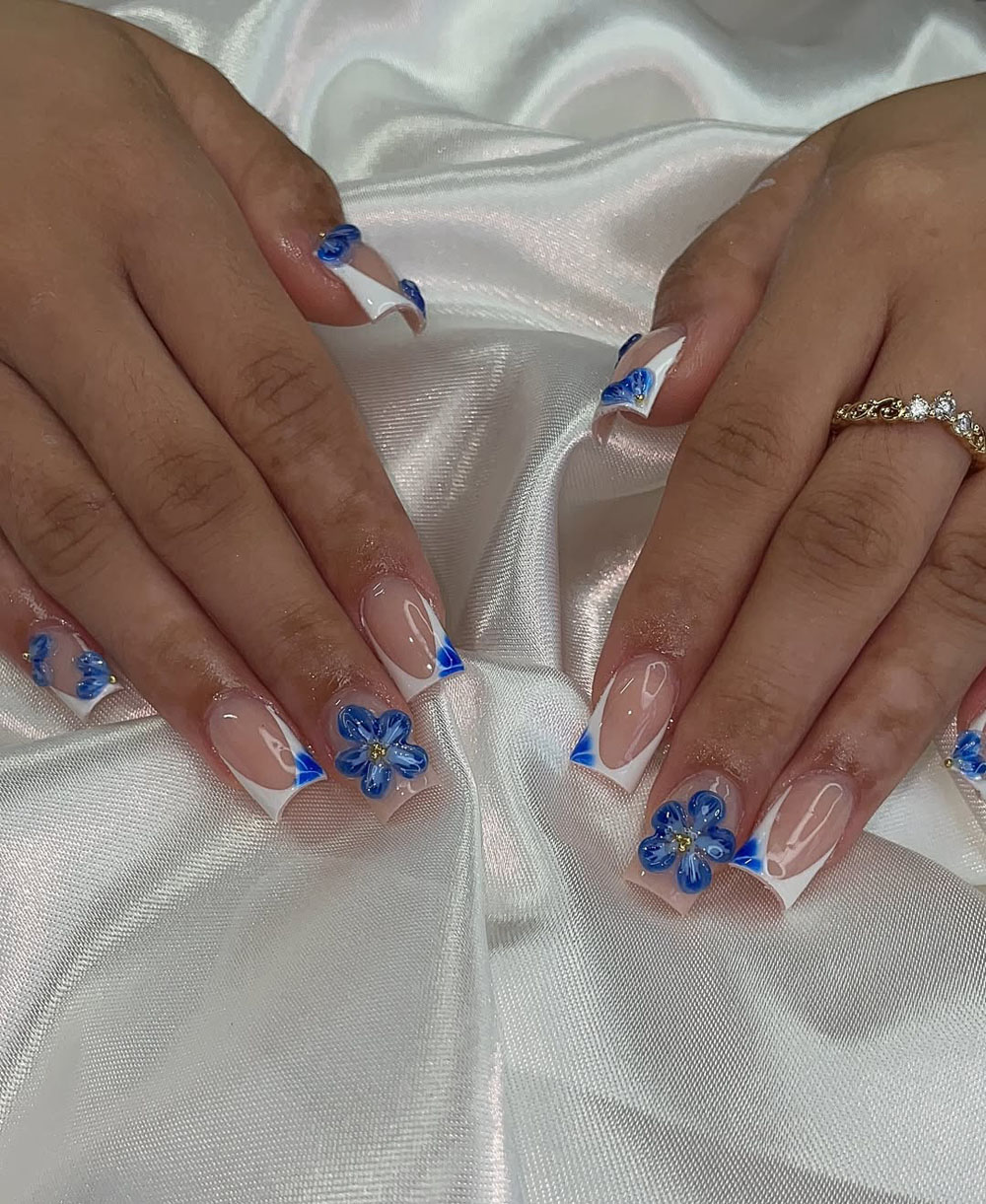 If you’re craving something fresh but still soft and elegant, this one’s totally your pick. Classic white French tips get a little summer twist with blue swooshes and those stunning 3D floral details. That glossy finish plus tiny gems in the flower centers? Ugh, so dreamy.