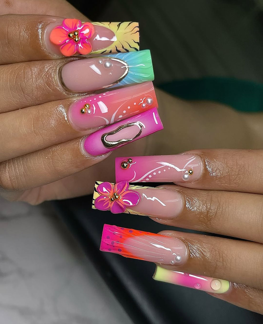 One look and you’ll be dreaming of palm trees and poolside drinks! This design is a literal tropical vacation on your fingertips—with neon hibiscus flowers, rainbow gradient tips, 3D pearls, and abstract art in every direction. It’s bold, colorful, and full of fun little surprises that make each nail stand out on its own.