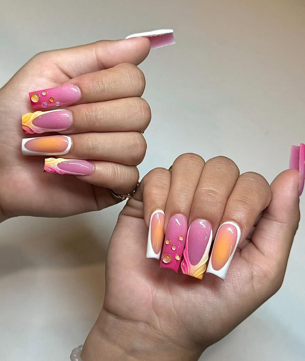 This one’s for the soft glam girls who love a little drama. These summer square nails blend warm tones of peach, orange, and pink in a gradient that totally feels like a sunset glow. The glossy water droplet accents take it to the next level, while the 3D swirl tips and crisp white edges add a super polished vibe.