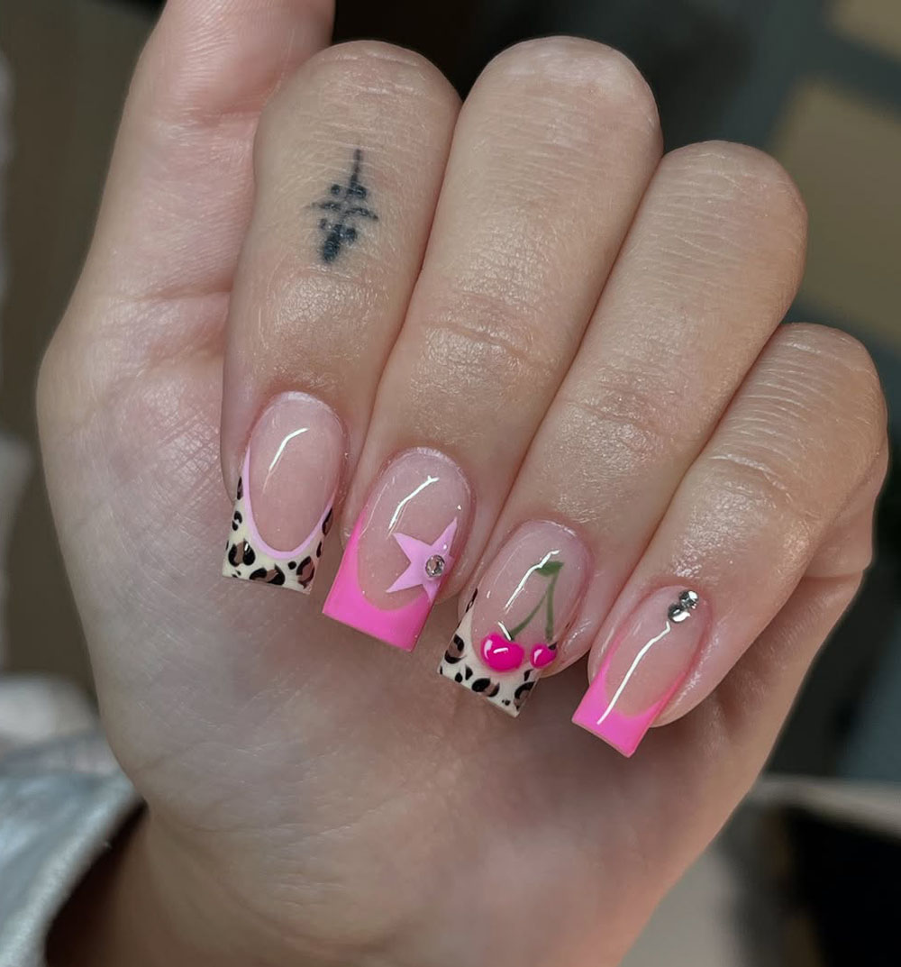 This one’s giving Y2K energy with a cute twist! A mix of hot pink French tips, tiny cherry art, and leopard print brings major fun to these short square nails. Each nail has its own moment, from a pink star and crystal bling to that fierce animal print detail—it’s playful, trendy, and just a little bit wild.