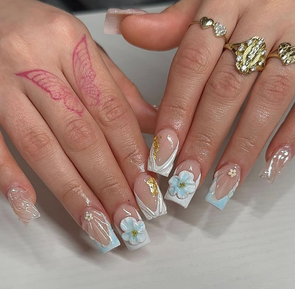 Let’s wrap it up with something soft and elegant! These blue and white 3D floral nails are dreamy and ethereal. The milky base with golden foil and delicate white swirls adds a super luxe touch, and those petals? Literal art.