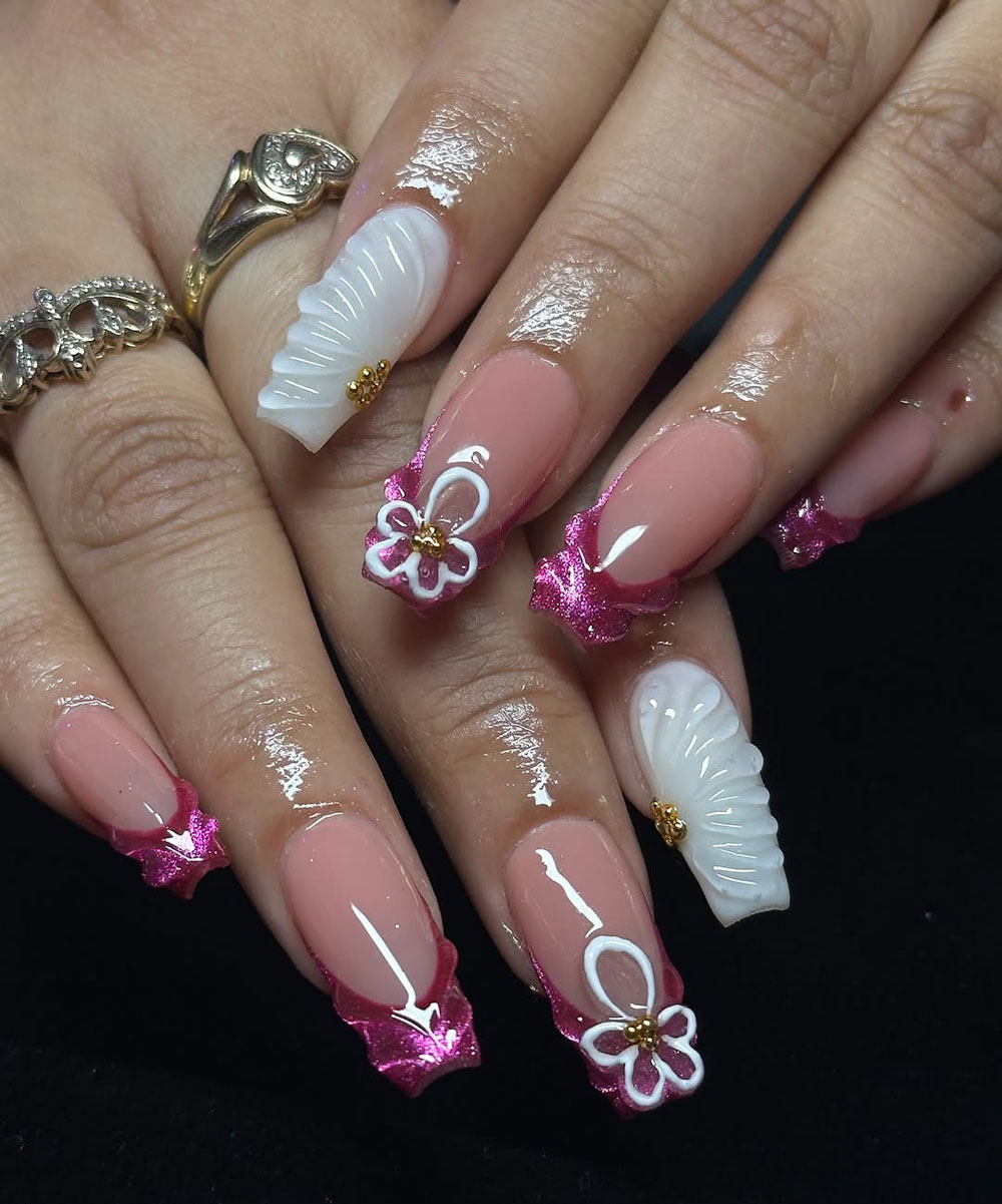 If you’re ready to slay the glam game, this set is for you. With sculpted white petals, hot pink glittery French tips, and dainty 3D white flowers outlined in gold—every detail screams elegant but make it extra. That shimmer is just unreal in the light, and the glossy nude base keeps things classy.