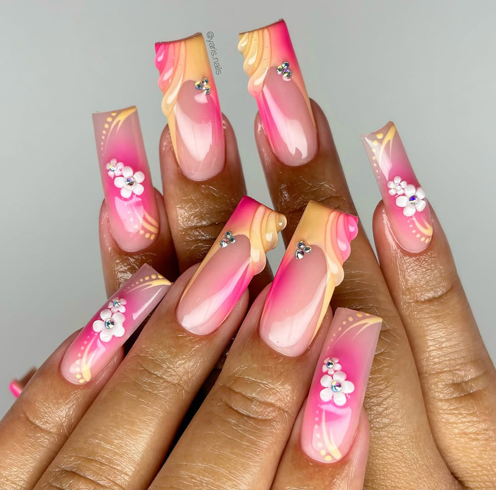If you’re into florals and tropical vibes, this one’s calling your name. The gradient of sunset pinks and golden tones feels like golden hour in paradise, and those glossy waves on the tips? Literal sunshine in nail form. Add in the delicate 3D floral accents, and this set is pure vacation romance.
