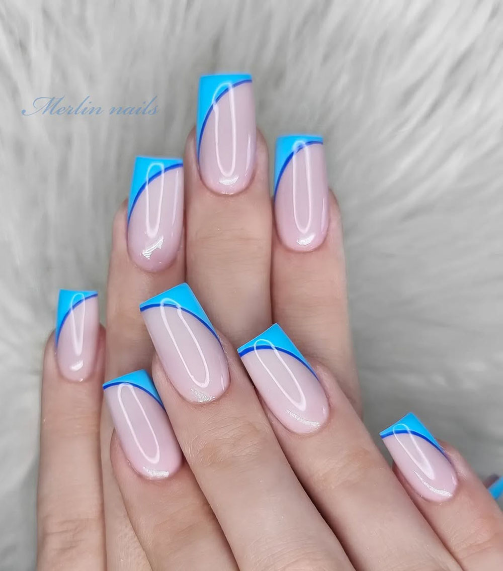 Simple, but make it electric. These cool-toned blue French tips are a summer staple, but the diagonal curve detail gives it that modern, graphic edge. Clean nude base + vibrant blue = a fresh twist on the classic.