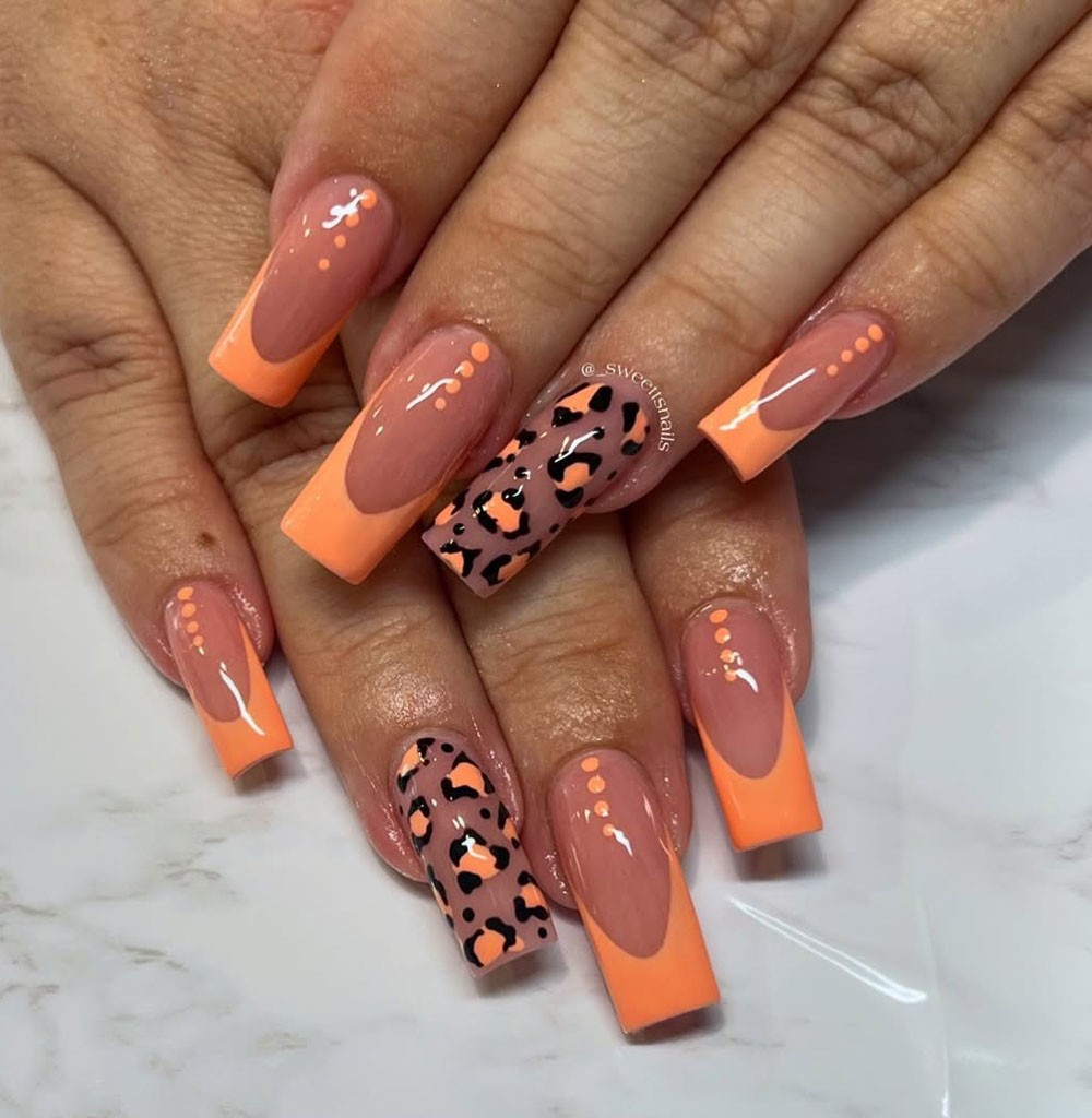 Here’s a bold and spicy look that’s still totally wearable! These square tips go full summer mode with soft orange Frenchies and just a hint of cheetah print magic. It’s got that playful edge but still feels coordinated and polished thanks to the dot detailing and clean layout.