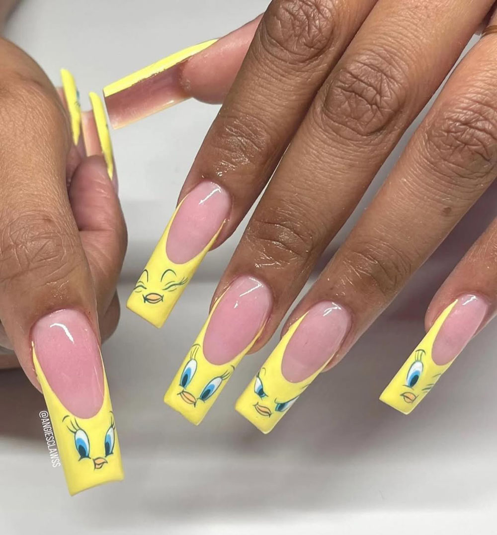 OK but how fun is this?! Cartoon nails are trending hard this season, and this set brings the playful energy to a whole new level. Each nail features Tweety’s little expressions on a soft yellow French tip. It’s giving retro, bold, and totally nostalgic in the best way.