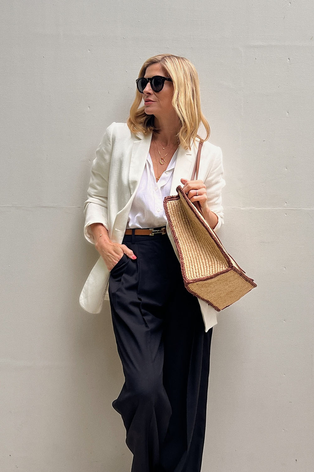 OMG, how chic is this look?! A light, off-white blazer over a relaxed white blouse and navy high-waist trousers—it’s totally channeling that effortless French style. Add in a straw tote and minimal accessories and it suddenly feels like you’re walking to a morning café after sending that important email.