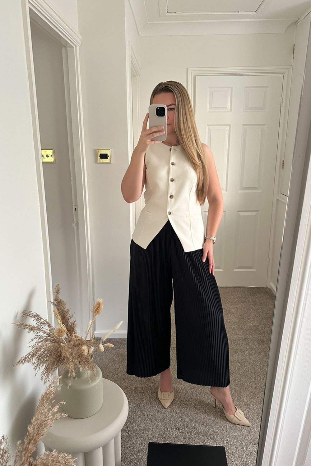 This one’s giving boss energy with a soft twist. The creamy sleeveless vest top is tailored just right and pairs perfectly with those flowy black pleated culottes. The shape? Flattering. The color contrast? On point. And those cream pointed heels? Total elegance.