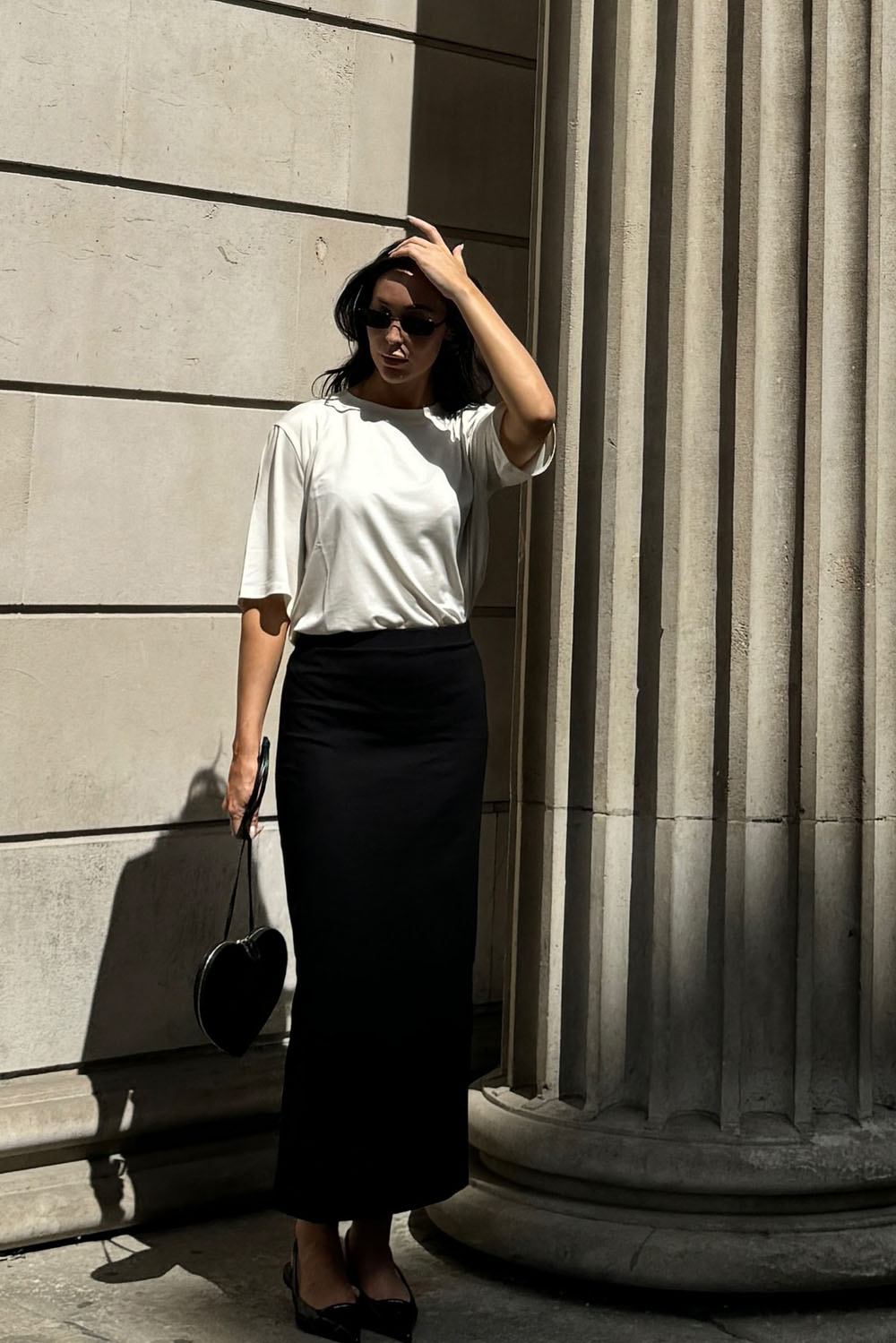 Add in classic black flats and a tiny heart-shaped purse, and suddenly it’s got a sweet, artsy flair. This outfit is perfect for a chic office environment, gallery events, or just feeling like a style icon on your lunch break. Love the shadowy drama of this whole vibe!