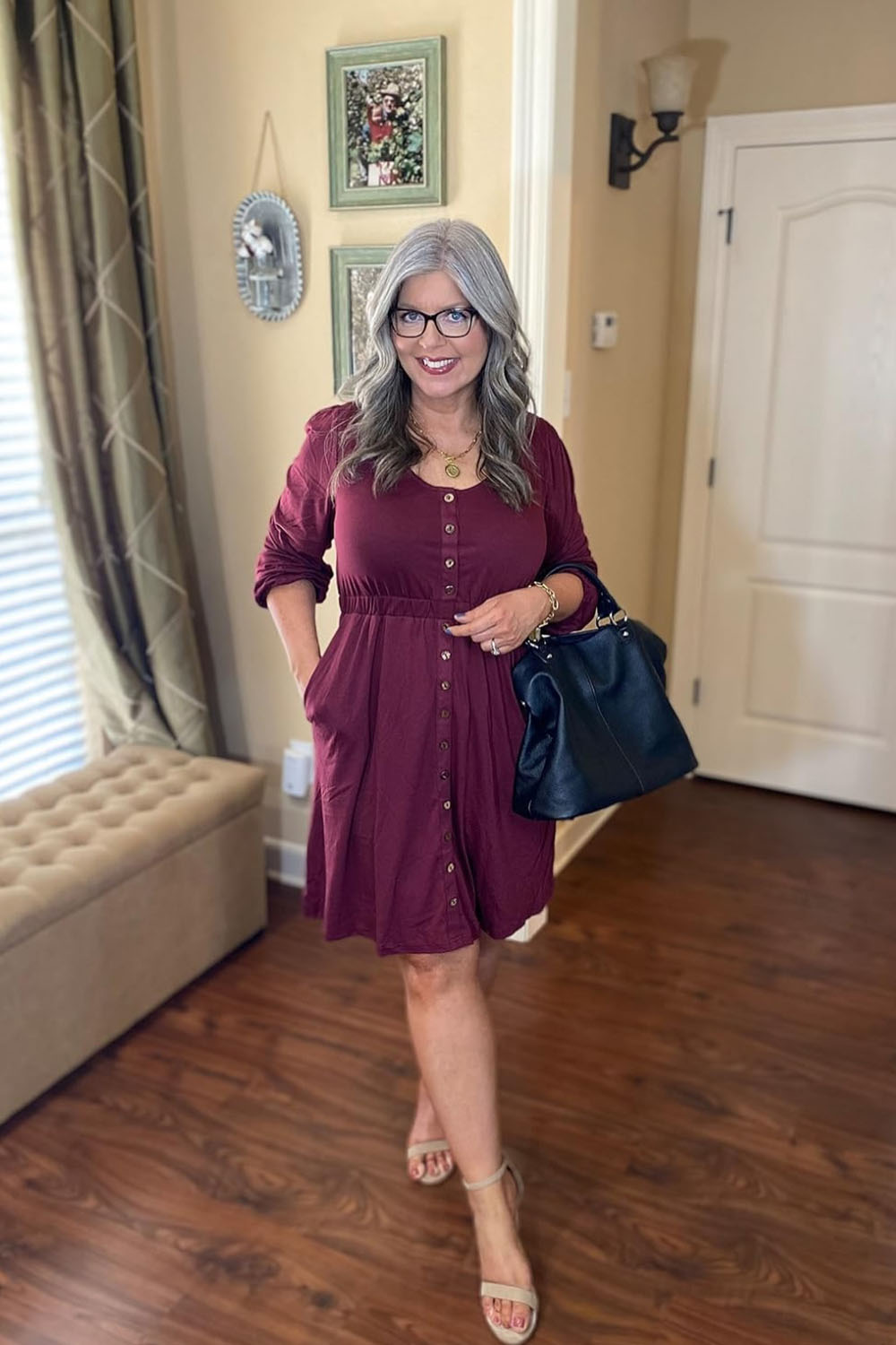 Here’s a fresh way to style your workday! This button-down maroon dress is everything. It’s structured enough to look professional, but loose and flowy enough to keep you breezy all summer long. The cinched waist detail gives it shape without being tight, and those sleeves? Just the right length for AC-chilled offices!