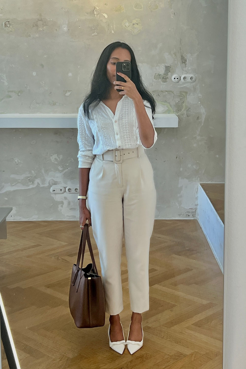 Those white pointed heels add a sharp edge, while the roomy brown tote keeps things grounded and practical. Whether you’re working downtown or hitting up a client meeting, this look delivers quiet luxury with real-world function.