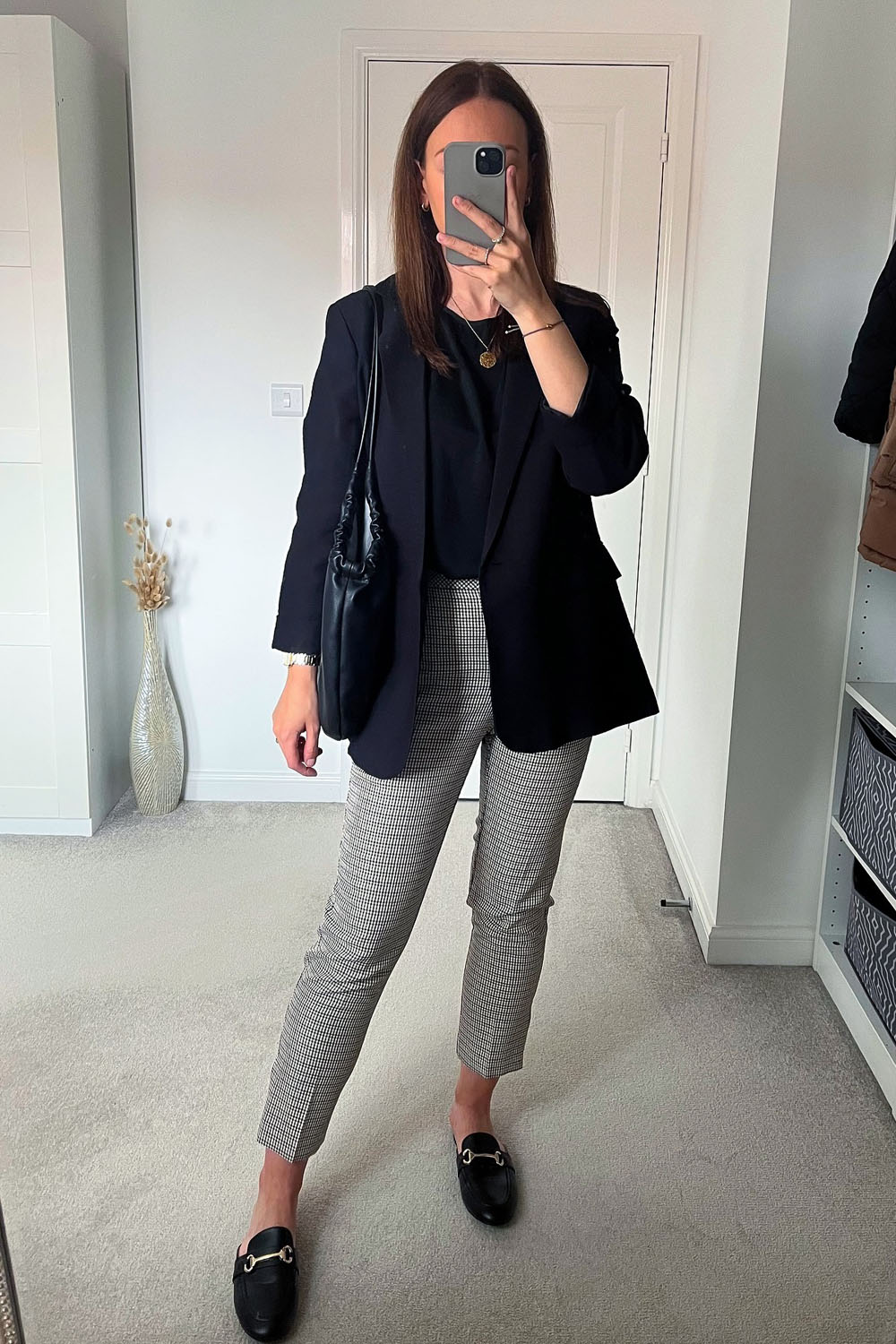 Add in those sleek black loafers with the gold bit detail — such a polished touch — and a roomy black handbag, and boom! You’ve nailed that “cool, collected professional” look without even breaking a sweat. This one’s great for days packed with meetings, or anytime you want to walk into the room like you own it.
