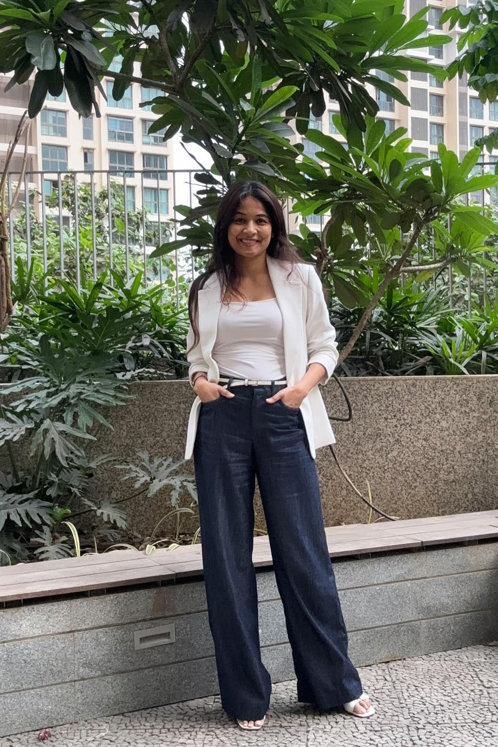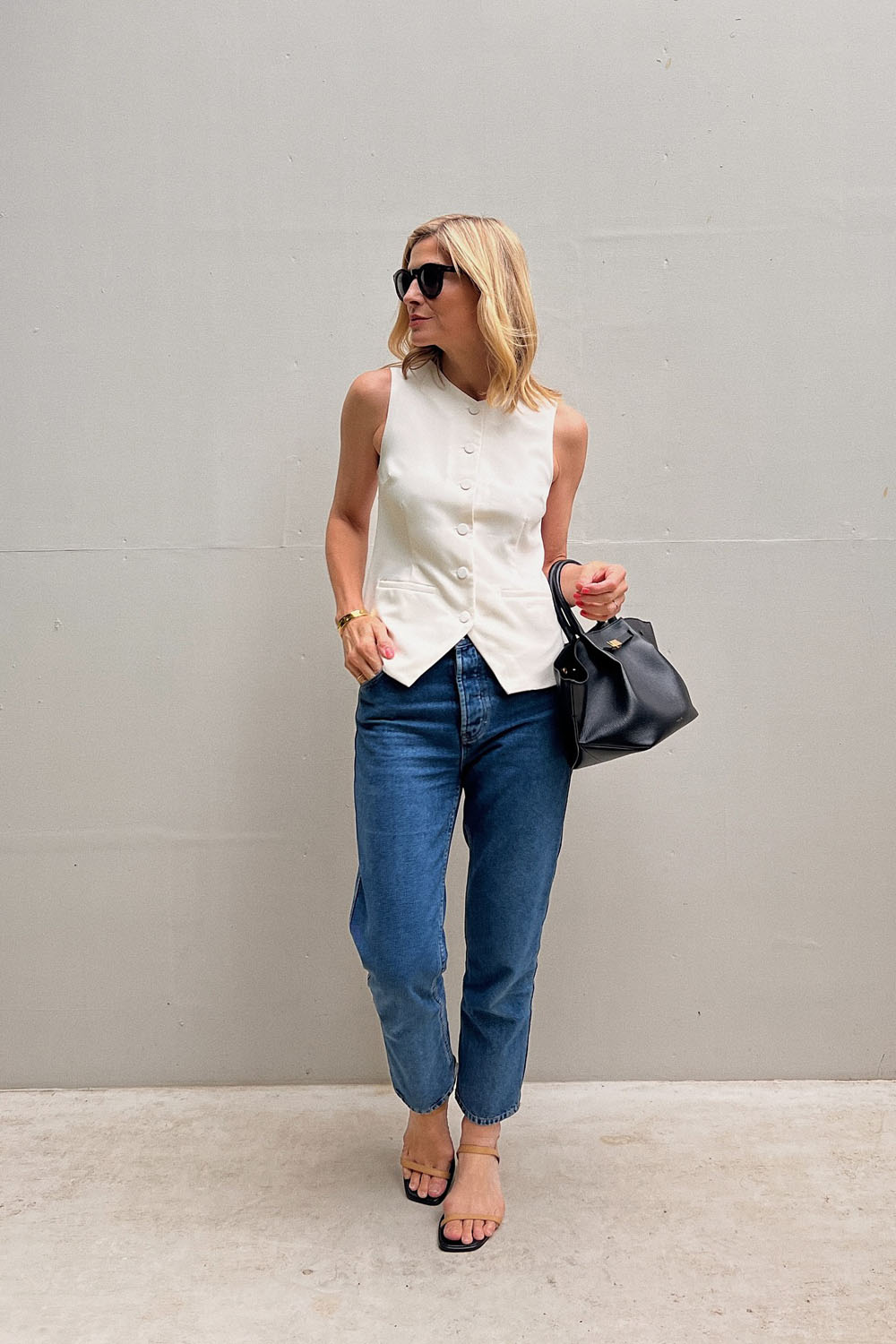 Here’s a fresh take on casual Friday that doesn’t feel lazy. This ivory sleeveless vest with tailored seams is giving modern sophistication, while the relaxed blue jeans keep it chill. Together? They strike that perfect balance of effort and ease — like you’ve got places to be but know how to stay cool doing it.