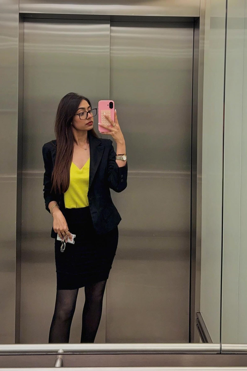 This one’s got confident queen written all over it. A fitted black blazer and classic pencil skirt combo creates a sleek silhouette, but the real star? That pop of neon yellow! It instantly energizes the whole outfit and makes it clear you’re not afraid to stand out — in the best way.