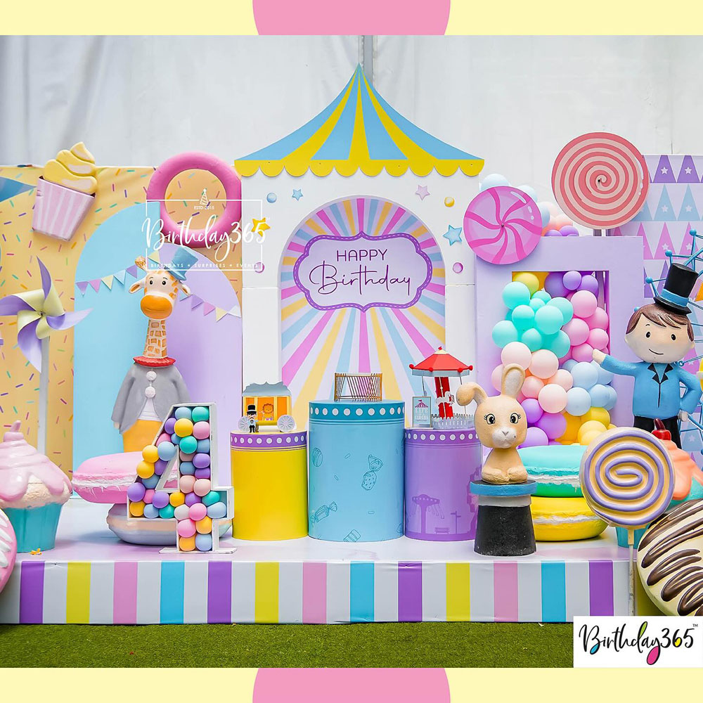Sugar, smiles, and sweetness all around! This candy-themed party is colorful, fun, and full of energy. Use oversized lollipop decorations, cotton candy stations, and pastel balloons. A candy buffet (toddler-safe options!) is always a hit.