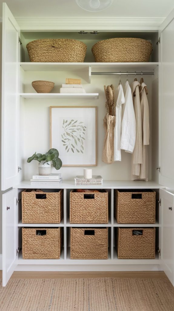 I prefer cabinets, baskets, and drawers over open shelves. Visual quiet matters as much as physical order. Less visible clutter equals less mental noise.