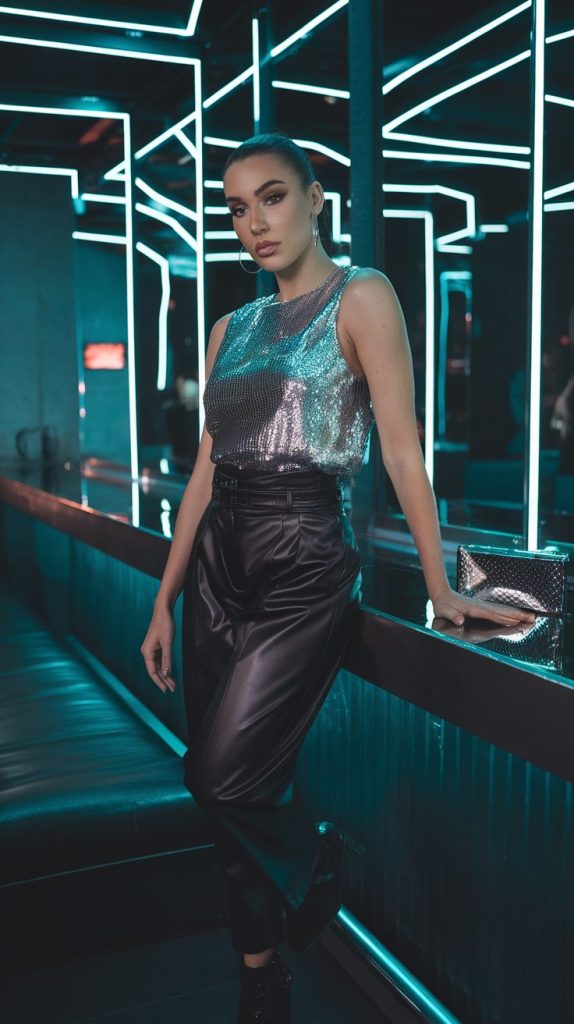 Faux leather pants are sleek, bold, and surprisingly warm (bonus points if they’re high-waisted). Pair them with a sequin or metallic top—because nothing says “I own this dance floor” like catching the light from every angle.