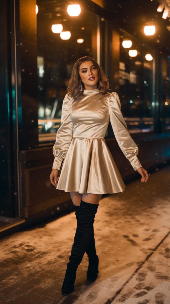 The classic “I didn’t try too hard but look amazing anyway” combo. A satin mini dress feels luxe and drapes beautifully, while over-the-knee boots add instant glam (and warmth). It’s the perfect blend of flirty and functional.
