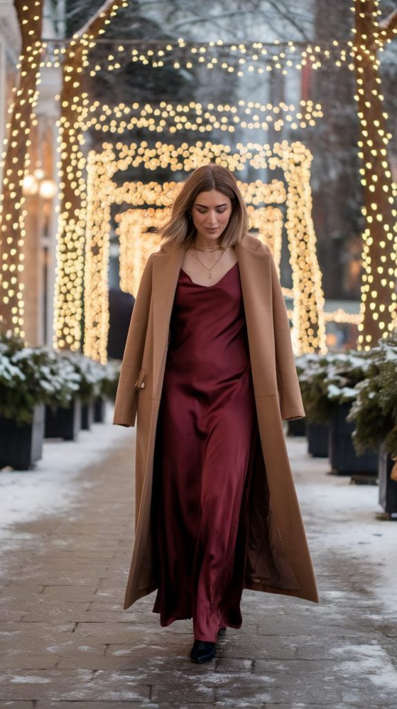 A silky slip dress under a structured long coat gives that perfect blend of sexy and sophisticated. It’s effortlessly elegant—like something out of a romantic movie.